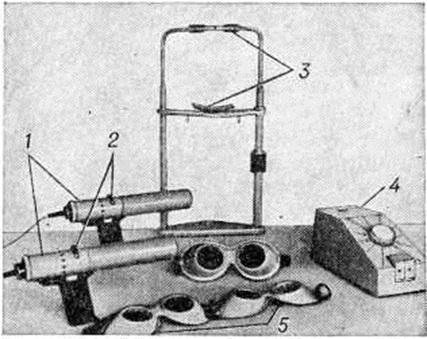 Для компенсации угла косоглазия, определения и развития фузионных резервов, подбора средств коррекции применяют наборы призм с разной преломляющей силой, призменные линейки и бипризмы. Наиболее отвечают медицинский требованиям по своим функциональный свойствам и эксплуатационным качествам бипризмы. Большинство бипризм имеет размеры, позволяющие применять их в пробных оправах одновременно с корригирующими линзами. В Советском Союзе выпускается бипризма офтальмокомпенсатор ОКП-1, преломляющая сила которой меняется до 30 диоптрий. Стереооптические приборы применяются для исследования бинокулярного глубинного зрения и стереоскопического зрения. Для исследования и восстановления бинокулярного глубинного зрения предложен Ряд приборов, прототипом которых является прибор Геринга. В СССР выпускаются два прибора для восстановления нормального бинокулярного глубинного зрения — стереокорректор КБЗ-1 и стереолокализатор ЛБЗ-1. Приборы для исследования и лечения двигательного аппарата глаз применяются для определения функциональный состояния глазодвигательной мышцы или групп мышц методом коордиметрии, для исследования и развития подвижности и конвергентных движений глаз, для контроля эффекта операции на глазодвигательных мышцах. Метод коордиметрии в СССР проводится с помощью прибора офтальмокоордиметра ОКМ-1 (рисунок 7). Для исследования и развития подвижности глаз предназначен прибор «Мускултренер» (СССР). Для исследования и развития конвергенции в СССР выпускается прибор под названием «Конвергенцтренер».