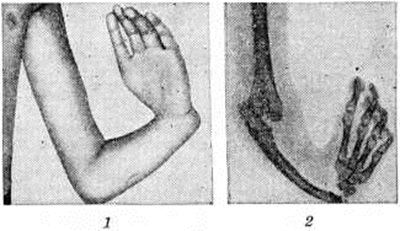 Лучевая косорукость возникает при полном отсутствии лучевой кости или её дистального отдела. Локтевая кость при этом обычно искривлена или (значительно реже) не деформирована. Кисть пронирована и образует с предплечьем угол, открытый к лучевой поверхности (рисунок 1, 1), отсюда и распространённое название деформации — manus vara. Кисть всегда смещена проксимально относительно выступающей к тылу головки локтевой кости и вращается вокруг её дистального отдела, как флажок флюгера. Кроме неправильного положения кисти, у большинства больных обращают на себя внимание признаки её недоразвития — отсутствие I пястной кости, I пальца и его возвышения. Нередко отсутствуют также II и III пальцы. Пальцы в большинстве случаев находятся в состоянии сгибательной контрактуры. Иногда I палец укорочен, состоит из одной фаланги или висит на кожной ножке при отсутствии I пястной кости. Предплечье укорочено и в большинстве случаев искривлено выпуклостью дорсально. Г. Ф. Иванов, Г. А. Ильин при анатомическом исследовании находили признаки недоразвития почти всех мышц предплечья и плеча. Обычно отсутствуют плечелучевая мышца, длинные мышцы I пальца, супинаторы и пронаторы предплечья; в проксимальном отделе предплечья все мышцы слиты в общую массу. Часто отсутствует длинная головка двуглавой мышцы плеча. Недоразвит лучевой нерв, вплоть до полного отсутствия его на предплечье. При полном отсутствии лучевой кости отсутствует и лучевая артерия.