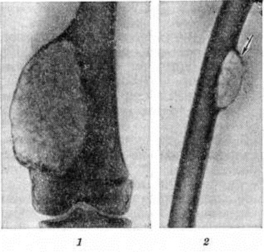 На рентгенограммах она выявляется в виде местного вздутия кости с истончением коркового слоя и ячеистой структурой. Костные перекладины в кисте придают ей сходство с гигантоклеточной опухолью (рисунок, 1). При локализации кисты в диафизе наблюдается краевой овальный дефект в кости, часто с наличием тонких костных перегородок; со стороны мягких тканей киста покрыта тонкой костной оболочкой (рисунок, 2).