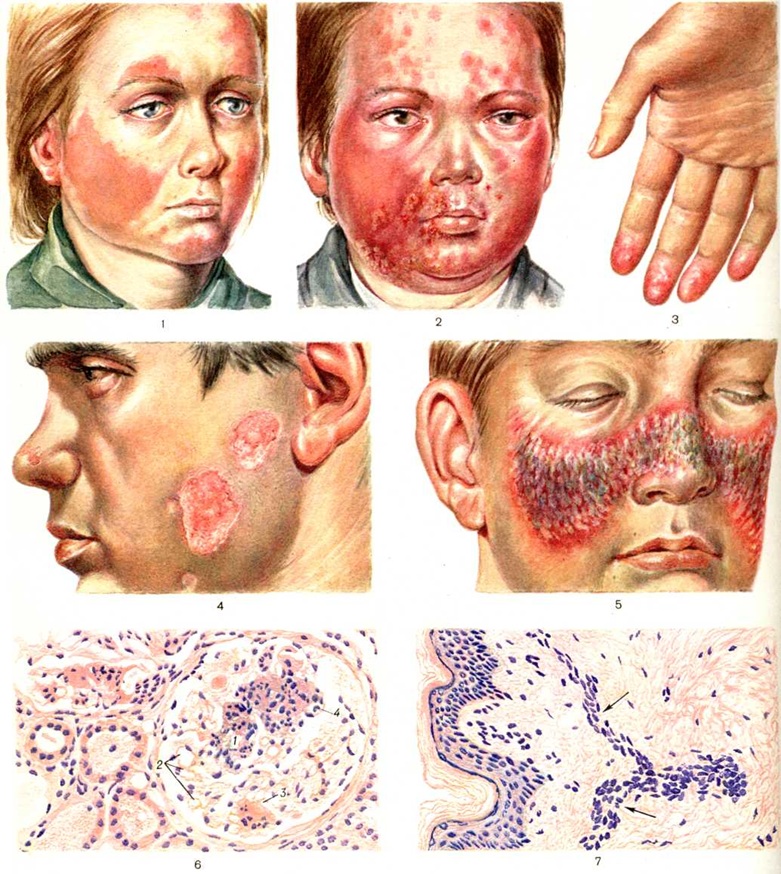 Патогенез. При системной Красная волчанка очевидна роль нарушений гуморального звена иммунитета с развитием органонеспецифических аутоиммунных реакций, что проявляется гиперфункцией В-лимфоцитов и широким спектром циркулирующих аутоантител (смотри полный свод знаний) — к цельным ядрам клеток и отдельным ингредиентам ядра (ДНК, нуклеопротеид), а также лизосомам, митохондриям, кардиолипидам (ложноположительная реакция Вассермана), свёртывающим факторам крови, лейкоцитам, тромбоцитам, эритроцитам, агрегированному гамма-глобулину (смотри полный свод знаний Ревматоидный фактор) и другие. Эти антитела, являясь антителами — свидетелями происшедшего повреждения, способны формировать циркулирующие иммунные комплексы, которые откладываются на базальных мембранах почек, кожи и другие, вызывают их повреждение с развитием воспалительной реакции. Таков иммуннокомплексный механизм развития люпус-нефрита, васкулитов и другие Наличие комплекса ДНК — антитело к этой ДНК и комплемента доказано выделением из ткани почки антител к ДНК, а сами иммунные комплексы обнаружены методом иммунофлюоресценции (смотри полный свод знаний). Высокая активность системной Красная волчанка характеризуется гипокомплементемией — снижением содержания цельного комплемента (СН50) и его компонентов, особенно С3, принимающего участие в реакции антиген—антитело, С4, СД1, С9 и другие (смотри полный свод знаний Комплемент). Накоплено много фактов, указывающих, что имеет место дисбаланс гуморального и клеточного звеньев иммунитета; последнее проявляется различными реакциями гиперчувствительности замедленного типа, снижением содержания Т-лимфоцитов. Наличие в отдельных семьях системной и дискоидной Красная волчанка, различных аутоиммунных болезней, фотосенсибилизации и непереносимости лекарственных препаратов, обнаружение широкого диапазона циркулирующих аутоантител у членов этих семей позволяют думать о роли генетического предрасположения в развитии болезни, однако конкретные механизмы этого предрасположения ещё не известны. Экспериментальные модели системной Красная волчанка — болезнь новозеландских мышей (NZB, NZW и их гибридов NZB/NZW F1) и собак особых генетических линий (canine lupus) — подтверждают высказанные выше положения, поскольку эти модели, безусловно, характеризуются генетическим предрасположением, дисбалансом в гуморальном и клеточном звеньях иммунитета и вертикальной передачей онкорнавируса С у новозеландских мышей. Клиническая картина. Жалобы больных разнообразны, но чаще всего они жалуются на боли в суставах, лихорадку, нарушение аппетита, сна. Как правило, системная Красная волчанка начинается подостро с рецидивирующего полиартрита, напоминающего ревматический, повышения температуры, различных кожных высыпаний, недомогания, слабости, потери веса. Реже наблюдается острое начало с высокой температурой, резкими болями и припухлостью суставов, симптомом «бабочки», полисерозитом, нефритом и другие. У 1/3 больных 5—10 лет и более наблюдается какой-либо из моносиндромов — рецидивирующий артрит, полисерозит, синдром Рейно, Верльгофа, эпилептиформный, но в дальнейшем болезнь приобретает рецидивирующее течение с развитием характерной полисиндромности. Волчаночный артрит наблюдается практически у всех больных; он проявляется мигр