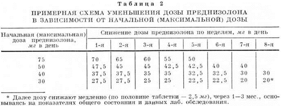 Антитела к ДНК определяются различными методами в РПГА (смотри полный свод знаний Гемагглютинация), в которой бараньи эритроциты нагружены ДНК, в реакции флоккуляции частиц бентонита (смотри полный свод знаний Флоккуляция), также нагруженных ДНК; кроме того, используют метод радиоиммунного связывания меченной по йоду нДНК и иммунофлюоресценции, где в качестве субстрата нДНК берут культуру Crithidia luciliae. При хронический полиартрите и тяжёлом поражении печени могут обнаруживаться положительные реакции на ревматоидный фактор в реакции Волера — Роуза (смотри полный свод знаний Ревматоидный артрит) или латекс-агглютинации (смотри полный свод знаний Агглютинация). Полезно также исследование комплемента СН50 и его компонентов, снижение которых обычно коррелирует с активностью волчаночного нефрита. Почти у всех больных значительно ускорена РОЭ — до 60—70 миллиметров в часов. Более чем у половины больных наблюдается лейкопения (ниже 4000 в 1 микролитров) со сдвигом в формуле крови до промиелоцитов, миелоцитов и юных в сочетании с лимфопенией (5—10% лимфоцитов). Весьма часто наблюдается умеренная гипохромная анемия. В редких случаях развивается гемолитическая анемия с чертами приобретённого гемолиза (смотри полный свод знаний) и положительной реакцией Кумбса (смотри полный свод знаний Кумбса реакция). Тромбоцитопения (ниже 100 000 в 1 микролитров) наблюдается часто, в редких случаях — синдром Верльгофа. Таким образом, при установлении диагноза системной Красная волчанка следует учитывать всю клинические, картину, данные лабораторный методов исследования и биопсийного материала почек, синовии и кожи. Для более полной оценки состояния больного целесообразно определять степень активности патологический процесса. Клинические, и лабораторный характеристика степеней активности системной Красная волчанка дана в таблице 1. Лечение, начатое в начале болезни, даёт наилучший эффект. В острый период лечение проводят в стационаре, где больным следует обеспечить полноценное питание с достаточным количеством витаминов группы В и С. Для индивидуализации лечения решающее значение имеет дифференцированное определение степеней активности патологический процесса (таблица 1). При патологический процессе III степени активности всем больным, независимо от варианта течения, показано лечение глюкокортикостероидами в больших дозах (в день 40—60 миллиграмм преднизолона или другого препарата в эквивалентных дозах), при II степени — соответственно меньшие дозы (30—40 миллиграмм в день), а при I степени — 15—20 миллиграмм в день. Чрезвычайно важно, чтобы начальная доза глюкокортикостероидов была достаточной для надёжного подавления активности патологический процесса. Особенно большие дозы (50—60—80 миллиграмм в день преднизолона) следует назначать при нефротическом синдроме, менингоэнцефалите и других диффузных процессах в нервной системе — так называемый волчаночном кризе. Лечение глюкокортикостероидами в максимальной дозе проводят до наступления выраженного эффекта (по данным снижения клинико-лабораторных показателей активности), а при нефротическом синдроме — не менее 2—3 месяцев, затем дозу гормона медленно снижают, ориентируясь на предлагаемую схему (таблица 2), но соблюдая принцип индивидуализации с целью предотвращения синдрома отмены или 