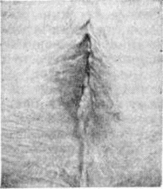 При осмотре кожа наружных половых органов истончена, сморщена; большие половые губы плоские, лишены волос; малые половые губы и клитор сглажены или отсутствуют, вход во влагалище сужен (рис.).