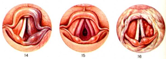 Ларингостенозом и даже асфиксией могут сопровождаться заболевания, при которых образуются корки на слизистой оболочке гортани (атрофический ларингит, озена, уремия) или фиброзно-плёнчатые налёты (дифтерия, гнойный трахеобронхит). Инфекционные гранулемы гортани, характеризующиеся образованием бугорков, инфильтратов, язв с перифокальным воспалением, доходящим до надхрящницы и хряща, завершаются развитием хронический Ларингостеноз При новообразованиях Ларингостеноз возникает, тогда, когда они, достигая значительных размеров, суживают просвет гортани, а также когда небольшие, но баллотирующие образования ущемляются между голосовыми складками. Обычно Ларингостеноз, обусловленный нарушением нервно-мышечного аппарата гортани, развивается медленно, затруднение дыхания нарастает постепенно, однако при присоединении воспаления слизистой оболочки гортани, физическом или эмоциональном перенапряжении может развиться удушье (смотри полный свод знаний Асфиксия). Ларингостеноз при инородных телах возникает в случаях их ущемления между голосовыми складками или внедрения в стенку подголосовой полости. Патологическая физиология. Являясь симптомом того или иного заболевания, Ларингостеноз в свою очередь вызывает нарушение функций различных органов и систем организма. По мнению ряда авторов, патогенетическими факторами возникающих при Ларингостеноз изменений в деятельности сердца, периферического кровообращения, почек, желудочно-кишечные тракта и другие являются нарушение режима внешнего дыхания и гипоксия. При сужении просвета гортани изменяется аэродинамика, интенсивность раздражения рецепторов тройничного, верхнего и нижнего гортанных нервов, гортанно-глоточных ветвей симпатического ствола, что меняет тонус коры и центров, расположенных в продолговатом мозге, а следовательно, и их влияние на органы и системы организма. Нарушение дыхания при Ларингостеноз приводит к гипоксии (смотри полный свод знаний), гиперкапнии (смотри полный свод знаний), накоплению недоокисленных продуктов обмена и развитию метаболического ацидоза (смотри полный свод знаний), что обусловливает резкое угнетение биохимический процессов в клетках, которые теряют способность усваивать кислород. Тканевая гипоксия приводит в свою очередь к целому комплексу патологический нарушений как в центральная нервная система, так и в различных органах. Патологическая анатомия. При остром Ларингостеноз (например, воспалительном, травматическом) наблюдается гиперемированная или бледная, отёчная слизистая оболочка, утолщение слизистой оболочки подголосовой полости с сужением просвета. Иногда могут быть кровоизлияния, гематома, нарушение целости тканей, грануляции (цветной рисунок 14). При хронический Ларингостеноз определяются инфильтраты, язвы с перифокальным воспалением, рубцы, деформация элементов гортани, утолщение складок, сужение или закрытие просвета гортани. При Ларингостеноз, обусловленном склеромой или хондроперихондритом перстневидного хряща, в подголосовой полости видны валики, напоминающие третью пару складок, или концентрически суживающий просвет гортани инфильтрат (цветной рисунок 15). Иногда на стенках гортани имеются наложения мокроты, корок, плёнок. При специфических процессах (сифилис, туберкулёз, склерома) находят грану