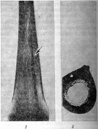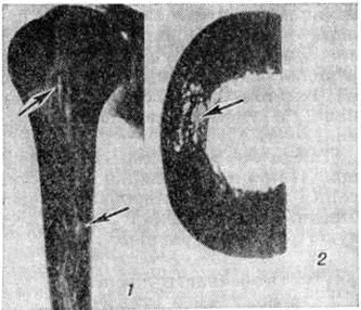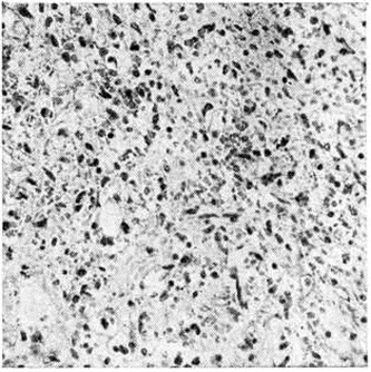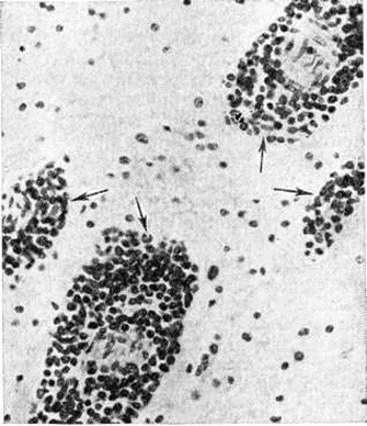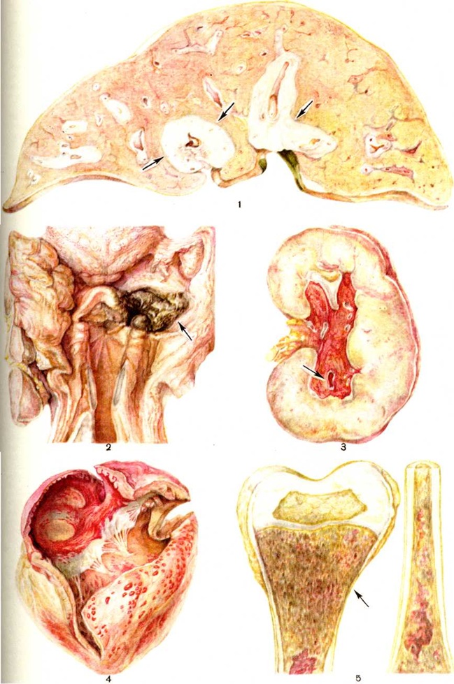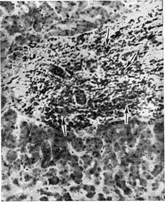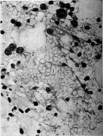 При всех формах Лейкозы наиболее интенсивное подавление лейкозной инфильтрации наблюдается в костном мозге. При вскрытии костный мозг плоских костей очагово или на всем протяжении суховатый, серого или серо-жёлтого цвета, в нем имеются участки жировой ткани и тёмно-красные поля кровоизлияний. При микроскопическом исследовании количество клеток в костном мозге снижено, видны поля опустошения различной величины, состоящие из отёчной стромы с наличием макрофагов и единичных бластных клеток (рисунок 8), зоны геморрагического пропитывания. Лейкозные инфильтраты располагаются очагово, содержат много клеток в состоянии лизиса, пикноза, распада (рисунок 9). Могут встречаться очаги некроза, представленные распадающимися лейкозными клетками, а также участки тотального коагуляционного некроза ткани с одновременной гибелью стромы. Иногда видны гигантские клетки с уродливыми гиперхромными ядрами, появление которых связывают с дистрофическими изменениями бластных элементов. Такие же клетки иногда выявляются в других органах. Динамическое исследование материала трепанобиопсий у больных острыми Лейкозы показывает, что уменьшение лейкозной инфильтрации с развитием гипопластических изменений закономерно наблюдается в костном мозге в фазе становления ремиссии. В стадии полной ремиссии имеет место выраженное в различной мере восстановление деятельной кроветворной ткани, однако все же нередко обнаруживаются бластные клетки в виде мелких скоплений или одиночно расположенных элементов. При острых, а также хронический Лейкозы протекающих с повторными ремиссиями, часто имеется заметное увеличение жировых клеток (рисунок 10); в связи с длительным применением кортикостероидов нарастают процессы резорбции костного вещества, отражением чего является резкое истончение, а местами полное разрушение костных балок (рисунок 10). Эти изменения наиболее выражены при острых Лейкозы у детей и могут сопровождаться образованием известковых метастазов. Описаны отдельные наблюдения распространённого нефрокальциноза (смотри полный свод знаний). Заметное снижение размеров лейкозных инфильтратов часто отмечается в селезёнке, лимфатических, узлах, печени (рисунок 11). В этих органах, как и в костном мозге, обнаруживаются различных размеров поля опустошения, геморрагического пропитывания ткани, группы лейкозных клеток с их распадом; при длительном течении возможно очаговое разрастание аргирофильных и коллагеновых волокон, частичное восстановление лимфатических, ткани в лимфоидных органах. При хронический длительно леченном миелолейкозе имеется резкий фиброз пульпы селезёнки с перестройкой её структуры (рисунок 12), участки липоматоза в лимфатических, узлах. Под влиянием лечения в связи с уменьшением объёма разрастаний все чаще при острых Лейкозы (даже при условии значительной продолжительности жизни больного) лимфатических, узлы, селезенка и печень сохраняют нормальные размеры и вес или бывают увеличены незначительно. При хронический Лейкоз, хотя размеры органов увеличены, однако не столь сильно, как до использования цитостатических средств. Значительное подавление лейкозного процесса иногда сопровождается развитием распространённых апластических изменений в костном мозге. Такой исход отмечается преимущественно при массивно