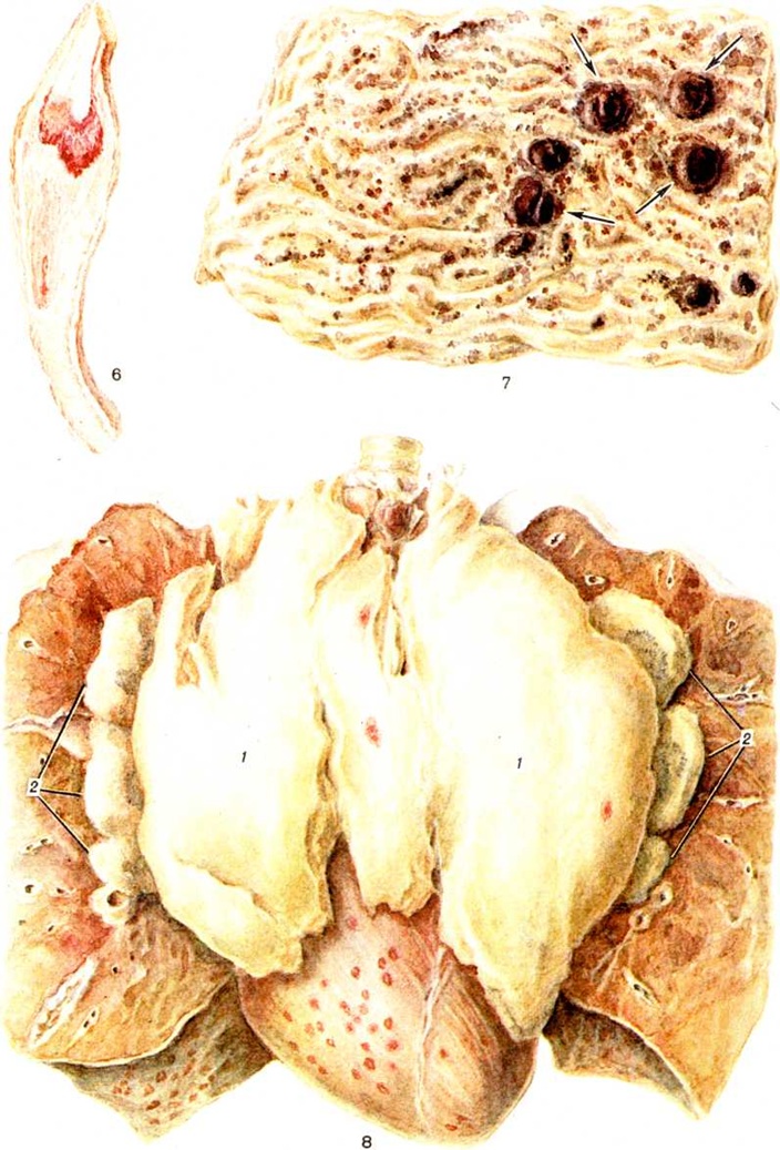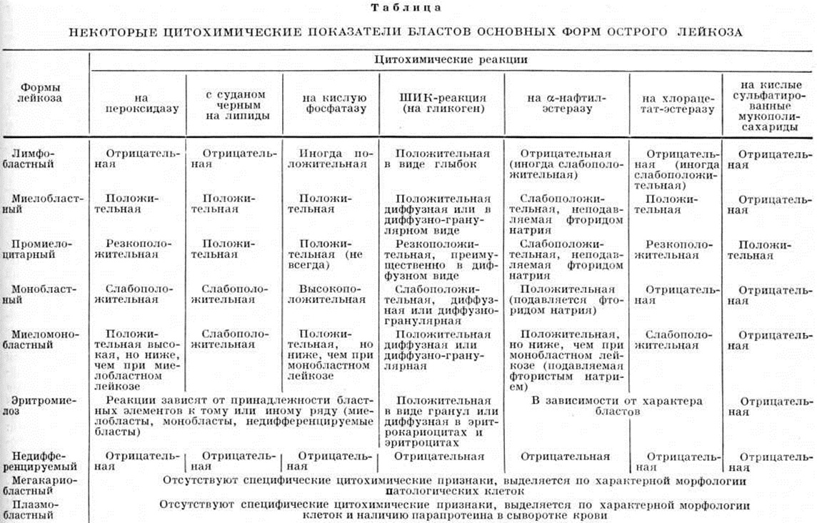 Высокий удельный вес среди причин смерти имеют пневмонии. Причинами смерти являются также общее малокровие и нарушение функции печени, сердца, лёгких и других органов, связанное с массивным специфическим поражением или сдавлением их и магистральных сосудов увеличенными лимфатических, узлами. Иногда смерть наступает от сопутствующих заболеваний — обострения туберкулёза, инфаркта миокарда, рака и другие. Хронический моноцитарный лейкоз характеризуется разрастанием клеток типа моноцитов, дающих положительную реакцию на неспецифическую эстеразу. На вскрытии обычно наблюдаются изменения, свойственные распространённому лейкозному процессу. Имеет место диффузное поражение костного мозга, довольно часто — значительное увеличение селезёнки, печени, возможно вовлечение в процесс всех групп лимфатических, узлов, желудочно-кишечного тракта. Нередко выявляются обширные опухолевые разрастания, локализующиеся главным образом в средостении и забрюшинном пространстве. Часты общее истощение, водянка полостей, анасарка. Геморрагии обычно выражены умеренно. Патологоанатомическую картину при макроглобулинемии Вальденстрема, миеломной болезни, эритремии, хронический сублейкемическом миелозе (остеомиелофиброзе) — сантиметров Вальденстрема болезнь, Миеломная болезнь, Остеомиелофиброз, Полицитемия. Особенности патоморфоза лейкозов в связи с лечением. При современных методах лечения патологоанатомическая картина Лейкозы как у детей, так и у взрослых часто отличается от типичной определёнными особенностями. Они выражаются уменьшением объёма лейкозной инфильтрации и возникновением гипо и аплазии в кроветворных органах, усилением дистрофических и некробиотических, а также фиброзных изменений, развитием разнообразных тяжёлых инфекционные осложнений. Морфологически проявления патоморфоза наиболее ярко представлены при острых Лейкозы особенно лимфобластном. Подавление лейкозного процесса может быть выражено в разной степени как уменьшением размеров разрастаний, так и исчезновением их в различных органах. В зависимости от этого при леченых Лейкозы может наблюдаться четыре основных варианта морфологический изменений: 1) очаговое уменьшение лейкозных разрастаний в кроветворных органах, главным образом в костном мозге; 2) значительное снижение лейкозной инфильтрации в кроветворных и других органах; 3) интенсивное подавление лейкозного процесса в костном мозге с сохранением обширных разрастаний за его пределами (внекостномозговая локализация); 4) выраженная распространённая лейкозная инфильтрация.