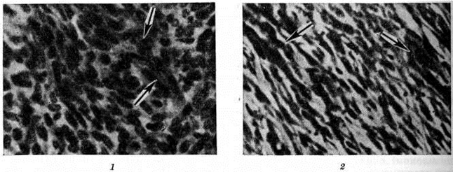 Макроскопически опухоль имеет вид узла диаметром до 20 см и более, мягкую или плотную консистенцию. Поверхность разреза опухоли серо-красного цвета, часто пестрая из-за наличия очагов кровоизлияний и некрозов. При микроскопическом исследовании Лейомиосаркома состоит из крупных вытянутых клеток с округлыми гиперхромными ядрами и большим количеством патологический митозов. Отмечается резкий полиморфизм клеток и ядер (рисунок, 1), встречаются гигантские многоядерные клетки. Опухолевые клетки складываются в пучки (рисунок, 2), нередко с ритмическим расположением ядер. Строма представлена неравномерной рыхлой сетью аргирофильных волокон, сгущающихся вокруг сосудов, синусоидного или капиллярного типа, часто с гиалинизированными стенками. На отдельных участках опухоль может напоминать лейомиому, отличаясь от неё резкой атипией клеток и инфильтрирующим ростом. Метастазирование Лейомиосаркома гематогенное, метастазы, как правило, возникают рано.
