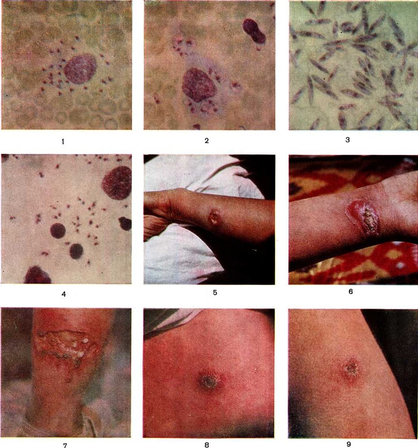 При зоонозном кожном Лейшманиозы, протекающем более остро, иммунитет вырабатывается быстрее. Кожная проба становится положительной примерно с 10—15-го дня, а полную невосприимчивость к суперинфекции можно наблюдать уже на стадии язвы, на 3—4-м месяцев заболевания. Циркулирующие антитела при кожном Лейшманиозы обнаруживались нерегулярно и, как правило, в низких титрах в РСК, Реакцию иммунофлюоресценции, реакции преципитации в агаре и лишь в случаях с поражением лимфатических, узлов. Перекрёстный иммунитет между антропонозным и зоонозным кожным Лейшманиозы Старого Света существует. В то же время клинические и экспериментальные данные свидетельствуют об отсутствии перекрёстного иммунитета между болезнями, вызываемыми L. mexicana и L. Braziliensis. Для большинства форм кожного Лейшманиозы характерно клинической выздоровление при практическом отсутствии антител в крови и раннее появление гиперчувствительности замедленного типа в то время, когда невосприимчивость к повторному заражению ещё не развилась. При экспериментальном изучении на моделях in vivo и in vitro в культурах тканей установлено, что экскретируемые факторы (EF) лейшманий подавляют переваривающую активность макрофагов, благодаря чему паразит имеет возможность размножаться, приводя клетку хозяина к гибели. Иммунные макрофаги способны угнетать размножение лейшманий и даже убивать их. Клеточный иммунитет играет важную роль в защите от паразита. Клиническая картина. Кожный Лейшманиозы. протекает циклично. Н. Ф. Родякин указывает на общие для обоих вариантов кожного Лейшманиозы клинические, проявления: первичная лейшманиома (стадия бугорка, изъязвления и рубцевания), последовательная лейшманиома (ранняя, поздняя), диффузно-инфильтрирующая лейшманиома и туберкулоид. При антропонозном кожном Лейшманиозы инкубация составляет 2—8 месяцев, редко дольше (до 3—5 лет), поражение появляется в виде папулы-бугорка, увеличивающегося медленно (к 5— 6-му месяцу до 1—2 сантиметров). Бугорок гладкий, буровато-красный, через 3—5 месяцев появляются чешуйки, через 5—10 месяцев поверхностное изъязвление (рисунок 5). Язва чаще круглая с неровными краями, окружена мощным приподнятым инфильтратом, увеличивающимся до 10—13-го месяцев. Отделяемое скудное, серозно-гнойное, ссыхается в бурую корку. Вокруг язв иногда появляются воспалительные узелки — бугорки обсеменения, изредка лимфангииты. Постепенно инфильтрат уплощается, эпителизация язвы обычно начинается с краёв, рубец красноватый, впоследствии бледнеет. Длительность болезни чаще около 1 года, иногда до 2 лет и более. Число язв 1—3, редко больше. Клинические, картина последовательных лейшманиом зависит от времени их появления: ранние развиваются параллельно с первичной, поздние — абортивно, без изъязвления. При локализации поражений на лице, стопах и кистях, чаще у пожилых, развиваются диффузно-инфильтрирующие лейшманиомы с небольшим поверхностным изъязвлением, которые, рассасываясь, как правило, не оставляют заметных рубцов. Туберкулоидная форма клинически напоминает туберкулёзную волчанку, процесс локализуется в основном на лице, в области постлейшманиозного рубца. Основным элементом является желтовато-бурый бугорок (1—3 м), изолированный или сливающийся в бугорковые инфильтраты; одновременно существуют и изъязвляющиеся бугорки, пок