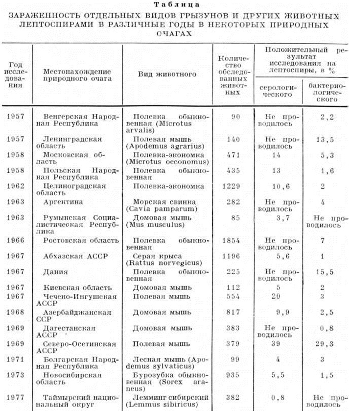 От грызунов в природном очаге выделяются штаммы лептоспир, относящиеся к различным серогруппам, например, в Европейской части СССР обнаруживают преимущественно штаммы из серогрупп Grippotyphosa, Pomona, Hebdomadis, Icterohaemorrhagiae, Canicola и другие. Многие исследователи утверждают, что существует связь между серотипами лептоспир и видами грызунов — их носителей. Так, от полевой мыши чаще выделяют лептоспиры из серогруппы Pomona, от полёвки-экономки — из серогрупп Grippotyphosa, а от крыс — из серогруппы Icterohaemorrhagiae. Заражённость грызунов и других животных в природных очагах Лептоспироз представлена в таблице. Лептоспирозная инфекция у грызунов протекает в хронический форме с формированием носительства и длительной лептоспироурии. По данным В. В. Ананьина и Е. В. Карасевой (1961), лептоспиры, концентрируясь в почках грызунов, могут выделяться с мочой в течение 188 дней. Заражение грызунов в очаге возможно при поедании растений, загрязнённых мочой больного животного, через инфицированную воду и при половом контакте. Заражение Лептоспироз людей в природных очагах происходит через воду открытых водоёмов (при работе в воде, купании, стирке белья и тому подобное), заражённую животными — лептоспироносителями. Лептоспиры могут проникать в организм человека как через кожу, так и через слизистые оболочки, в том числе слизистую оболочку кишечника. Обычными местами инфицирования являются временные водоёмы, появляющиеся после разливов рек, болот, прудов, ручьев и небольшие речки с медленным течением воды. Роль кровососущих членистоногих в переносе возбудителей от больного грызуна человеку отрицается, однако имеются сообщения о выделении лептоспир от клещей, снятых с больных животных или собранных в природном очаге Лептоспироз Среди заболевших в природных очагах преобладают лица, выполняющие различные с.-х. работы (сенокос, уборка овощей и другие). Заболевание может носить массовый характер и поражать сотни и даже тысячи людей. Особенно большие эпидемии Лептоспироз описаны в прошлом среди людей, работавших в природных очагах после сильных дождей и разливов рек. Заболевание имеет выраженную сезонность (июнь—август). В тропических странах заболевание людей Лептоспироз в природных очагах связано с работой на плантациях каучука, сахарного тростника, риса и другие. Имеется основание полагать, что на формирование природных очагов Лептоспироз влияет физических-химический состав воды и почвы. В местностях, где вода обладает кислотностью или повышенным содержанием минеральных солей, Лептоспироз не наблюдалось. Антропоургические очаги встречаются в сельской местности и в городах. Сельские антропоургические очаги связаны с наличием Лептоспироз преимущественно среди сельско-хозяйственных животных (крупный и мелкий рогатый скот, свиньи, лошади и другие), а также собак и крыс. Наибольшее значение как источник возбудителей имеют крупный рогатый скот и свиньи. Эпизоотии Лептоспироз среди сельско-хозяйственных животных описаны во многих странах мира и, по данным советских авторов, именно эти животные в 90—95% служат причиной заболевания людей. У крупного рогатого скота Лептоспироз может протекать как бессимптомно, так и с ярко выраженными клинические, признаками: высокой температурой, поносом, появлением желтухи и гемоглобинурии, поражением кожи и слизистых оболоче