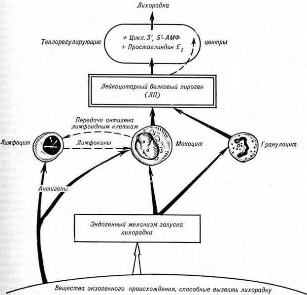 Долго не разрешался спор о том, зависит ли разогревание тела при Лихорадка только от повышения теплопродукции или от ограничения теплоотдачи. Эти споры были разрешены А. А. Лихачёвым и П. П. Авроровым (1902), применившими для изучения теплообмена человека при малярии и при мышечной работе первый в то время точный калориметр системы В. В. Пашутина. Они показали, что развитие Лихорадка связано (рисунок 1) как с ростом теплопродукции (смотри полный свод знаний) в основном в период озноба, так и с регуляторным (относительным и абсолютным) ограничением теплоотдачи (смотри полный свод знаний). Эта работа заложила основы понимания физиологический механизма изменений температуры тела при Лихорадка как терморегуляторной реакции (смотри полный свод знаний Терморегуляция). Выводы этих авторов получили подтверждение и развитие в работах Бенедикта и Карпентера (F. G. Benedict, Е. Carpenter, 1909), Н. В. Веселкина (1913—1915), Дюбуа (Е. DuBois, 1922—1927), Е. С. Граменицкой (1959), П. Н. Веселкина с сотрудники (1957—1963) и другие Вместе с тем в начале 20 век в теоретической патологии возникло стремление возвратить понятие «Лихорадка» к представлению о лихорадочной инфекционной болезни. Сущность Лихорадка усматривали в сложном симптомокомплексе глубоких нарушений обмена веществ и физиологический функций в результате инфекционные интоксикации; повышение же температуры тела при этом считали явлением вторичным, пассивным, связанным с повышением обмена веществ и теплопродукции на фоне токсического нарушения и недостаточности механизмов теплоотдачи. По признаку наличия глубоких расстройств обмена и функции при инфекционные болезни считали возможным говорить о Лихорадка и при нормальной или даже пониженной температуре тела больного. Эта умозрительная концепция противоречила клиническим и экспериментальным данным о механизме повышения температуры тела при Лихорадка, тормозя дальнейшее изучение Лихорадка Очень скоро преобладающими в науке стали взгляды времён С. П. Боткина на Лихорадка как на терморегуляторную реакцию, типовой симптом лихорадочных болезней. Лефевр (J. Lefevre, 1929), например, определял Лихорадка как «возмущение» терморегуляции, адаптирующее гомойотермный организм на уровне температуры более высоком, чем нормальный её уровень. Вторая половина 20 век знаменательна успехами в изучении пирогенных свойств различных бактерий. Выяснилось, что между патогенностью и пирогенностью прямой зависимости нет. Культуры непатогенных микробов (например, Вас. mesentericus), живые и убитые, обусловливают при введении в организм высокую Лихорадка, хотя инфекционные процесса и не возникает. Сильным пирогенным действием обладает эндотоксин грамотрицательных бактерий (носитель их специфической антигенности и токсичности), анализ структуры которого показал, что высоко пирогенна его липополисахаридная термостабильная фракция; освобождённая от белка, эта фракция лишена не только специфической токсичности, но в значительной мере и антигенности. Из ряда грамотрицательных микробов стали получать очищенные от белка стандартизированные, высокоактивные пирогенные препараты, используемые в экспериментальной и клинические, практике, например пирогенал (смотри полный свод знаний). Эти препараты обычно называют бактериальными пирогенами. Аналогичные термостабильные пирогены были з