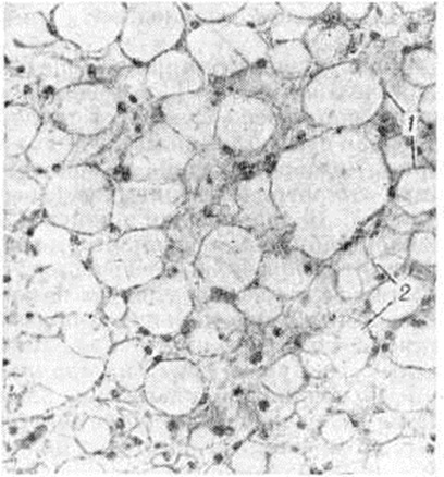 Макроскопически Липома имеет узловатую форму — узел дольчатого строения окружён капсулой; реже встречается так называемый диффузная Липома с разлитыми, лишёнными соединительнотканной капсулы разрастаниями жировой ткани — при болезни Деркума, синдроме Маделунга (смотри полный свод знаний Деркума болезнь, Маделунга синдром). Микроскопически Липома построена по типу жировой ткани и отличается от неё различными размерами долек и жировых клеток. Последние то очень малы, то достигают гигантских размеров (рисунок 1, 1). Между обычными жировыми клетками встречаются группы клеток с несколькими жировыми вакуолями — так называемый мультилокулярные клетки (рисунок 1, 2). Эти клетки некоторые авторы считают камбиальными.
