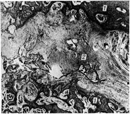 Длительная подвижность может привести к преобразованию кости в зоне перелома вначале в фиброзную, а затем и хрящевую ткань. Подвижность и нагрузка по оси при соприкосновении отломков и сохранившейся репаративной способности в них приводят к костеобразованию по боковым поверхностям отломков с их значительным утолщением, но без костной спайки между собой. Таким образом, формируются гипертрофические или гиперваскулярные Ложный сустав (рисунок 1). Общим для них является преобладание костеобразования и перестройки над рассасыванием кости. Обнажение отломков на значительном протяжении, их расхождение, исключающее соприкосновение и нагрузку с самого начала, массивное разрушение окружающих мягких тканей, приводит к недостаточному кровоснабжению концов отломков. Интенсивность репаративной реакции при этих условиях снижается и постепенно затухает, начинают преобладать процессы рассасывания. Концы отломков истончаются и заостряются. Так формируются атрофические или гиповаскулярные Ложный сустав, в которых рассасывание кости преобладает над костеобразованием (рисунок 2). По патогенезу врождённые Ложный сустав чаще всего относятся к атрофическому типу. Патологическая анатомия различна и определяет клинико-рентгенологический тип Ложный сустав При гипертрофическом типе Ложный сустав щель между отломками заполнена грубоволокнистой соединительной тканью (рисунок 3). При гиповаскулярном атрофическом типе Ложный сустав щель между отломками более значительна, она сначала также заполнена соединительной тканью (смотри полный свод знаний), однако при длительном (более 2—3 лет) существовании Ложный сустав в ткани между отломками может возникнуть щель, заполненная синовиальной жидкостью (смотри полный свод знаний), а по краям рубцовая ткань растягивается и приобретает характер суставной капсулы. Концы отломков при этом покрываются волокнистым хрящом, иногда с участками гиалинового хряща (рисунок 4). Так образуется «типичный» Ложный сустав с большой степенью подвижности (неоартроз), чаще всего развивающейся в зоне диафиза кости (рисунок 5).