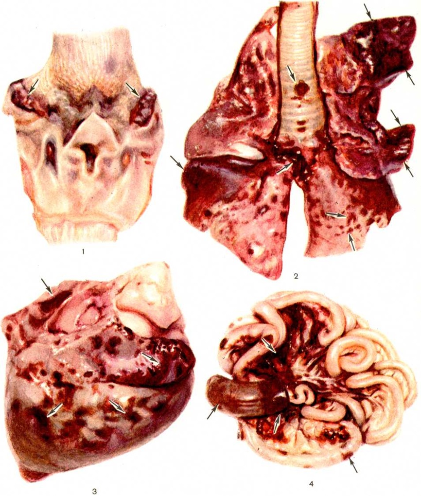 При выздоровлении обнаруживаются явления регенерации кроветворных клеток, но даже спустя длительное время на фоне снижения общего числа клеток костного мозга, как правило, обнаруживается задержка дифференцировки и созревания клеток; в гематологические препаратах преобладают более молодые клеточные элементы. Регенерация лимфоидной ткани наступает позднее, чем восстановление костного мозга: в лимфатических, узлах формируется корковый слой с диффузным расположением клеточных элементов, затем образуются фолликулы и позже наступает восстановление паракортикального слоя (зона Т-лимфоцитов). При Лучевая болезнь развиваются типичные изменения половых желёз, особенно мужских. В латентном периоде обнаруживаются прекращение митотического деления и распад эпителия яичек, появление отдельных уродливых крупных и гигантских клеток; в период разгара заболевания в канальцах яичек отсутствует герминативный эпителий, сохраняются лишь отдельные сперматогонии и клетки Сертоли. В яичниках наблюдаются дистрофические и некробиотические изменения, которые первоначально наступают в более зрелых фолликулах и заключаются в гибели яйцеклеток, а несколько позже — клеток внутреннего слоя зернистой оболочки. Высокочувствительна к ионизирующему излучению слизистая оболочка тонкого кишечника, ранние изменения которой проявляются деструкцией и подавлением митотической активности клеток эпителия крипт с появлением патологический форм митоза. К моменту развития выраженных клинические, признаков заболевания эти изменения, как правило, исчезают. Терминальные изменения связаны с расстройством крово и лимфообращения, аутоинфекционными процессами: слизистая оболочка отёчна, имеются участки изъязвлений и некроза, на поверхности которых видны расплавленные массы фибрина, слизь и колонии микроорганизмов; почти полностью отсутствуют лейкоцитарная инфильтрация, пролиферация местных соединительнотканных и эпителиальных клеток. Крупные пищеварительные железы относятся к категории малочувствительных к ионизирующему излучению органов, однако при микроскопическом исследовании, например, в печени, обнаруживаются нарушения кровообращения и признаки дистрофии, а к моменту гибели — значительные деструктивные изменения с признаками микробной и вирусной инвазии (смотри полный свод знаний Гепатит, лучевой). В сердечно-сосудистой системе при острой Лучевая болезнь глубокие изменения локализуются главным образом в мелких сосудах, что имеет значение в патогенезе геморрагического диатеза. Морфологически признаки увеличивающейся проницаемости сосудов в виде отёка стенки, некоторого набухания и отслойки эндотелия, нарастающего периваскулярного отёка и разволокнения сосудистых стенок обнаруживаются ещё до возникновения кровоизлияний. В период разгара Лучевая болезнь видны диапедезные кровоизлияния, диффузное пропитывание стенок сосудов эритроцитами и явления плазморрагии. В сердце имеются дистрофические изменения мышечных волокон, кровоизлияния под эндокард, в миокард и особенно под эпикард. В лёгких при острой Лучевая болезнь обнаруживаются изменения, связанные с нарушением кровообращения и инфекционные осложнениями, среди которых особого внимания заслуживает так называемый агранулоцитарная пневмония, сопровождающаяс