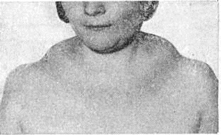 В клинические, картине Маделунга синдром отмечается значительное утолщение шеи, при котором жировые разрастания охватывают затылочную и переднебоковые её поверхности (рисунок); у некоторых больных имеют место также множественные симметричные липоматозные узлы на туловище и конечностях. Больные Маделунга синдром вначале жалуются на изменение внешнего вида и чувство напряжения в затылочной области. Боли возникают лишь при значительном, особенно при глубоком, разрастании жировой ткани.