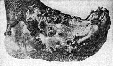 Клиническая картина. Первые клинические, проявления болезни могут возникнуть спустя несколько недель, месяцев и даже лет после проникновения возбудителя в организм. На месте проникновения грибков под кожей появляются единичные, величиной с горошину узлы, имеющие неправильные округлые очертания и плотноватую консистенцию. Узлы несколько болезненны при пальпации, кожа над ними синюшно-красноватая, с лиловым оттенком. Дальнейшее увеличение узлов сопровождается их размягчением и постепенным формированием абсцессов (в течение нескольких месяцев или лет). Гнойник вскрывается, образуются длительно существующие свищи с гнойным или гнойно-кровянистым отделяемым. Оно характеризуется сиропоподобной вязкостью, зловонным запахом и наличием грибковых друз, видимых невооруженным глазом. Друзы имеют вид зёрнышек, величиной 2— 3 миллиметров. Спустя некоторое время свищи закрываются, на их месте образуются рубцы, рядом формируются новые узлы с тем же циклом развития. В течение 3—4 лет процесс медленно распространяется на здоровые участки мягких тканей и костей стопы. Появление все новых узлов и дальнейшая их эволюция сопровождаются гноетечением и отёком всей стопы, которая увеличивается в размерах и приобретает бесформенный вид (рисунок 1). Тем не менее опорная функция стопы заметно не нарушается. Появляются признаки интоксикации — общая слабость, быстрая утомляемость, плохой сон, снижение аппетита, потеря веса. В крови отмечается снижение гемоглобина и числа эритроцитов, ускорение РОЭ, лейкоцитоз. Течение болезни длительное, иногда до 20— 30 лет.