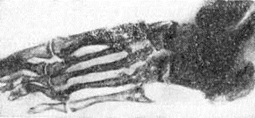 Рентгенологическое картина Мадурская стопа значительно отличается от поражений стопы при хронический воспалительных заболеваниях (остеомиелите, сифилисе, туберкулёзе и прочее), а также актиномикозе и других микозах. Изменения скелета стопы носят как деструктивный, так и вторичный реактивный характер, причём преобладают явления разрушения. Кости стопы пронизаны округлыми кистовидными деструктивными очагами, величиной от 3 до 10 миллиметров, которые вначале в виде краевых дефектов поражают корковое вещество кости, а затем полностью захватывают и губчатое вещество. Остаются незатронутыми обычно только фаланги и дистальные концы плюсневых костей. В типичных случаях кости изъедены изнутри и снаружи, крайне истончены, суставные поверхности широко расходятся (рисунок 2). Несмотря на деформацию скелета стопы, её костные элементы все же в основном не теряют нормальных взаимоотношений, и поэтому стопа как единое анатомо-функциональное целое сохраняет свои опорно-двигательные свойства. Остеосклероз и более или менее значительные периостальные реакции бывают редко, если только процесс не осложняется остеомиелитом, но при этом никогда не наблюдается секвестрации кости.
