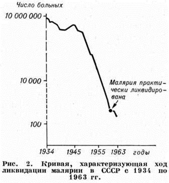 В 1951 год П. Г. Сергиев научно обосновал возможность полной ликвидации Малярия в СССР. При этом основное значение придавалось исчерпывающему выявлению больных обязательному исследованию крови на Малярия у лихорадящих больных, особенно среди прибывших из зарубежных стран, изоляции больных и их эффективному лечению, диспансерному наблюдению за переболевшими, паразитоносителями и их лечению. Практическая ликвидация Малярия была достигнута к 1960 год (рисунок 2), когда на всей территории СССР число случаев Малярия и паразитоносителей составило 425, то есть менее 2 больных на каждый миллион населения, число очагов — 238. С 1960 год развернулась плановая работа по ликвидации остаточных очагов Малярия и предупреждению возникновения Малярия на остальной территории. Передача Малярия полностью прекратилась почти на всей территории СССР. В стране более 15 лет у населения не обнаруживались P. falciparum, выявляются лишь единичные случаи четырёхдневной Малярия, возникающие после гемотрансфузии (свидетельство наличия у населения P. malariae), и регистрируются случаи трёхдневной Малярия в пограничных районах Азербайджана и некоторых республик Средней Азии. Эпидемиологическом обстановка по Малярия надёжно контролируется, несмотря на интенсивный завоз всех четырёх форм Малярия из зарубежных стран.