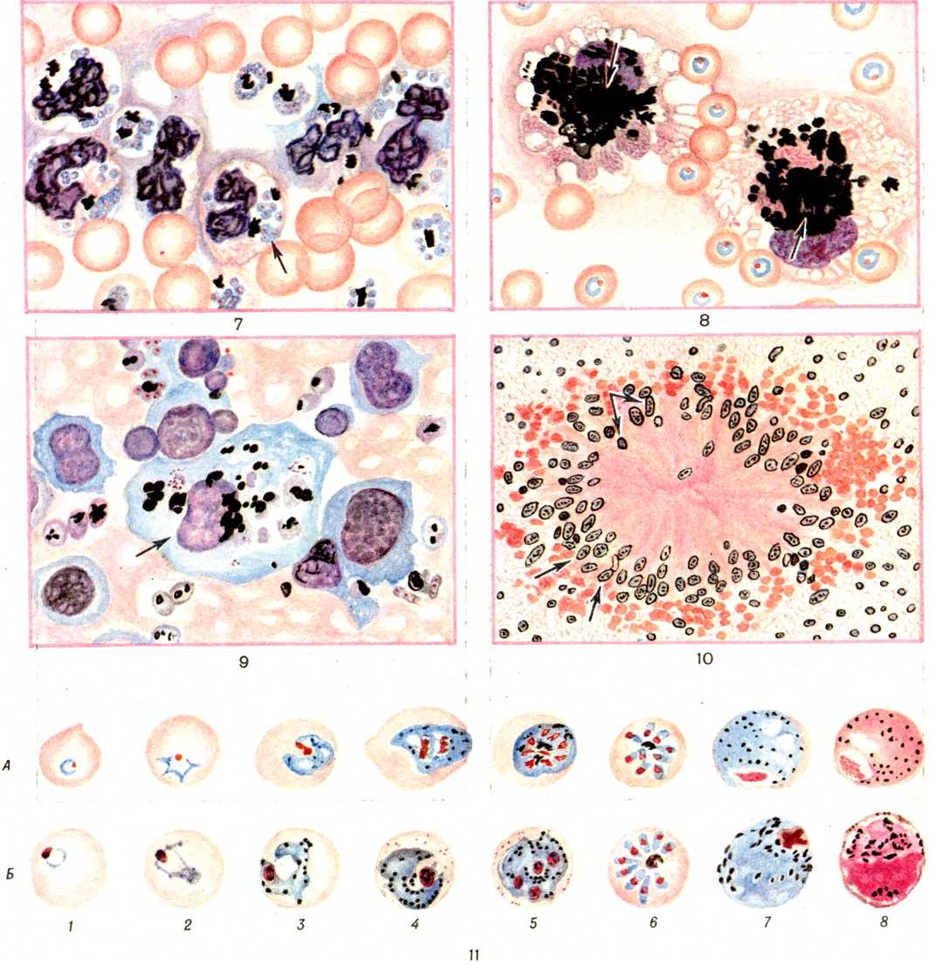 Большие изменения в заболеваемости Малярия произошли во всем мире в ходе реализации глобальной программы её ликвидации, начавшейся в 1955 год под эгидой ВОЗ. В первые 10 лет (1956—1965) были достигнуты значительные успехи на всех континентах, кроме Африки. Появились обширные зоны, свободные от Малярия, в Европе, Индии, США, на островах Карибского моря, в Мексике, Венесуэле. В дальнейшем процесс ликвидации Малярия замедлился и, наконец, практически прекратился. В 70-х годы вновь отмечаются заболевания Малярия в ранее оздоровленных районах Ирана, Ирака, Турции и Сирии. Малярия стала важнейшей проблемой здравоохранения в Индий, Шри Ланке и Бирме; заболеваемость ею резко возросла в Таиланде, на Филиппинах, в ряде стран Центральной и Южной Америки. На оздоровленных от Малярия территориях Европы, Северной Америки и Японии увеличилось число завозных случаев Малярия Это сопровождалось развитием вспышек болезни, увеличением летальности и ростом прививной Малярия Число заболевших Малярия в мире в 1976 год составило 150 миллионов человек На долю тропической Малярия приходится 50% всех случаев заболеваний, трёхдневной — 43% и четырёхдневной — 7%. В Африке (мировой «эпицентр» Малярия) ежегодно, по неполным данным, регистрируется от 2 до 17 тысяч заболеваний на 100 000 жителей. В ряде стран тропической Африки заболевания Малярия составляют в среднем свыше 12% общей заболеваемости. Летальность, непосредственно связанная с Малярия, равна примерно 1%. Погибает от Малярия более 1 миллионов человек в год, главным образом в тропической Африке. Во время катастрофических эпидемический подъёмов летальность при Малярия достигала 3—5%, в отдельных местностях и населённых пунктах — 20—40%. P. falciparum является причиной 98% всех летальных исходов при Малярия В 60—70-е годы наибольшая летальность при тропической Малярия отмечается в Европе и США; за период 1967—1972 годы она составляла в Европе 2,7% (в Великобритании в 1970—1973 годы— 5,2%), в США — 8,4%. Это обусловлено отсутствием иммунитета у большинства заболевших и неправильной или запоздалой диагностикой заболевания. Неудачи программы ликвидации Малярия в мире связаны с рядом факторов: охватившей капиталистический мир инфляцией, сокращением финансовой поддержки со стороны развитых капиталистических стран, нехваткой и удорожанием инсектицидов, появлением резистентности у переносчиков к инсектицидам и у возбудителей Малярия— к лекарственным препаратам, недостаточным числом подготовленного персонала и неудовлетворительным состоянием служб здравоохранения в некоторых странах. Советские граждане, выезжающие в эндемичные по Малярия страны, подвергаются риску заражения: в тропической Африке — преимущественно Р. falciparum, реже P. ovale и P. malariae и очень редко P. vivax; в Северной Африке — P. vivax; в Азии — преимущественно P. vivax, реже Р. falciparum (в Непале и на Филиппинах — P. malariae); в Центральной и Южной Америке — в основном P. vivax, реже P. falciparum. ЭтиологияВозбудители Малярия— одноклеточные микроорганизмы, относящиеся к типу Protozoa, классу Sporozoa, отряду Haemosporidia, семейству Plasmodiidae, роду Plasmodium. Известны 4 вида возбудителей Малярия человека: Plasmodium vivax (Grassi et Feletti, 1890) Labbe, 1899 — возбудитель трёхдневной Малярия; Plasmodium malariae (Laveran, 1881) Grassi et Feletti, 1890 — возбудитель четырёхдневной Малярия; Plasmodium falciparum Welch, 1897 — возбудитель тропической Малярия; Plasmodium ovale Stephens, 1922 — возбуд