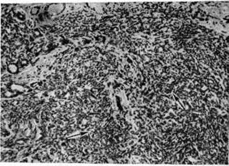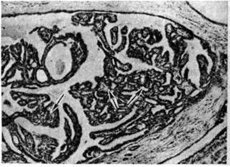 Особой разновидностью эпителиальной пролиферации при Мастопатия является склерозирующий аденоз. В так называемый цветущей фазе склерозирующего аденоза обнаруживаются очаги выраженной пролиферации эпителия ацинусов и миоэпителия (рисунок 3); образуются сплошные поля из мелких трубочек, тяжей, альвеол, лежащих в умеренно развитой строме. Постепенно процесс переходит в фиброзную фазу, при которой в полях гиалинизированной соединительной ткани сохраняются лишь отдельные, чаще всего тубулярные структуры, симулирующие в некоторых случаях гистологический картину инфильтративного рака. При пролиферативной Мастопатия выявляются также очаги фиброэпителиальной пролиферации с образованием мелких фиброаденом и цистаденопапиллом. Для цистаденопапиллом характерно формирование в протоках различной величины соединительнотканных сосочков, покрытых несколькими рядами цилиндрического или кубического эпителия (рисунок 4). В крупных протоках могут формироваться отдельные цистаденопапилломы , приобретающие самостоятельное клинические, значение.