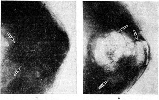 Диагноз. В диагностике Мастопатия применяются клин., морфологический и рентгенологическое методы исследования, которые приобретают особенно важное значение при дифференциальной диагностике узловых форм Мастопатия и рака молочной железы (смотри полный свод знаний). Материалом для цитологический исследования при Мастопатия служат пунктаты очаговых уплотнений молочной железы, мазки выделений из сосков, отпечатки с поверхности разреза узловых образований, взятые сразу после оперативного их удаления. Гистологический исследованию подвергается иссечённая ткань очаговых уплотнений и узлов. С помощью рентгенологическое исследования устанавливают наличие Мастопатия, определяют преобладание аденоза, кист или фиброзных изменений, наблюдают динамику процесса под влиянием лечения, выявляют возникший на фоне Мастопатия опухолевый узел или намечают место для пункции или эксцизии. Мелкокистозные образования молочной железы на рентгенограммах обнаруживаются в виде множественных округлых расплывчатых теней и участков однородного затемнения; более крупные кисты (от 0,5 до 4 сантиметров) дают округлые и овальные тени с чёткими ровными контурами (рисунок 5). Многокамерная киста имеет полициклические очертания (рисунок 6, а), тень её однородна с определяющимся нередко ободком просветления. После пункции кисты молочной железы производят цитологический исследование содержимого с последующей пневмокистографией (рисунок 6, б). Пневмокистография (смотри полный свод знаний) позволяет контролировать полноту опорожнения кисты и обнаруживать внутрикистозные гиперпластические и опухолевые образования.