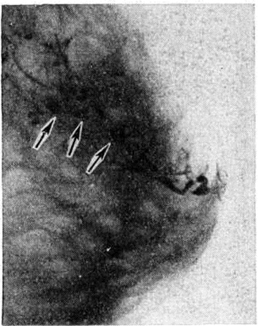 При поражении протоков молочной железы на рентгенограммах могут определяться их расширенные тени, в некоторых случаях видны внутрипротоковые отложения солей кальция в виде параллельных полосок или колец. При дуктографии обнаруживают деформацию и расширение протоков, кистовидные полости по их ходу или кистозные расширения концевых отделов (рисунок 8). При сочетании различных форм Мастопатия наблюдается нередко пестрая рентгенологическое картина, которую отдельные авторы образно сравнивают с «лунным рельефом»: определяется перестройка структуры железы с множественными участками затемнения и просветления разной формы и величины (рисунок 9), тень железы пересекают изображения соединительнотканных тяжей; на этом фоне могут быть заметны тени отдельных кист и фиброаденом.