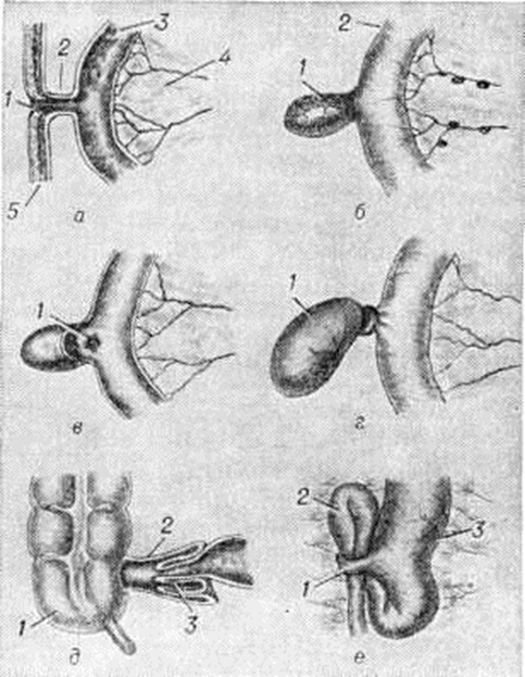 Рис. 1. Схематическое изображение патологических процессов, обусловленных дивертикулом Меккеля: а — полный пупочно-кишечный свищ (продольный разрез): 1 — пупочное отверстие свища, 2 — пупочно-кишечный свищ, 3 — подвздошная кишка, 4 — брыжейка, 5 — передняя брюшная стенка; б — дивертикулит: 1 — воспалённый дивертикул, 2 — подвздошная кишка; в — кровоточащая язва (1) дивертикула (частичный продольный разрез); грамм — заворот и некроз дивертикула: 1 — перекрученный отёчный дивертикул; д — инвагинация дивертикула (продольный разрез подвздошной кишки): 1 — слепая кишка, 2 — подвздошная кишка, 3 — головка инвагината, включающая в себя участок подвздошной кишки с дивертикулом; е — странгуляция тонкой кишки: 1 — дивертикул в виде тяжа, 2 — ущемлённая петля подвздошной кишки, 3 — нормальный участок кишки.