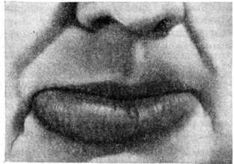 Симптомы заболевания возникают не одновременно; как отёк губы, так и неврит лицевого нерва (смотри полный свод знаний Лицевой нерв) возникают внезапно, затем рецидивируют. После нескольких рецидивов процесс становится стабильным, губа приобретает большие размеры, тестоватую консистенцию (реже плотноэластическую), красная кайма как бы вывернута. В результате неврита развивается парез мимических мышц, наблюдается асимметрия носогубных складок (рисунок). Складчатый язык обнаруживается не у всех больных (смотри полный свод знаний Глоссит). В период рецидивов могут быть головные боли, повышается температура тела.