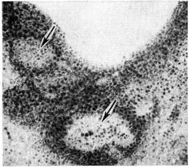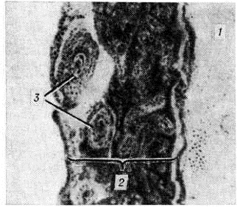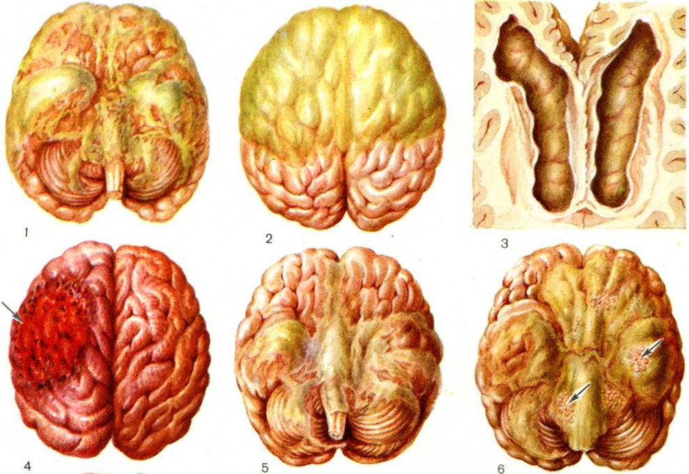 При гнойном Менингит воспалительный выпот имеет сначала серозный характер, а на 2—3-й день заболевания он приобретает вид гнойного экссудата. При этом мягкие оболочки полушарий мозга (цветной рисунок 1), сосудистые сплетения и эпендима пропитаны мутной желтовато-зеленоватой вязкой ЖИДКОСТЬЮ. При обильном накоплении гнойнофибринозный экссудат образует «чепчик» в лобной и теменной долях полушарий (цветной таблица, ст. 33, рисунок 2) или окутывает весь мозг сплошной массой. Он заполняет также мозговые полости, покрывая желтоватой плёнкой сплетения и стенки желудочков. Развивающаяся обтурация ликворных путей выпотом ведёт к острому расширению желудочков мозга (цветной рисунок 3) и церебральной гипертензии. В воспалительный процесс могут вовлекаться подоболочечные отделы мозгового вещества, но особенно часто области, окружающие желудочки. При своевременно начатом лечении гнойный экссудат подвергается ферментативному распаду и резорбции, но в некоторых случаях он организуется, вызывая спаечный процесс в оболочках и желудочках мозга. Развивается хронический гнойный или хронический продуктивный (адгезивный) лептоменингит, характеризующийся частичной облитерацией подпаутинного пространства с образованием между листками мягкой оболочки замкнутых гнойных или серозных полостей. Спайки могут рассекать также и желудочки мозга, формируя отдельные заполненные гноем или цереброспинальной жидкостью камеры. Макроскопическую картину хронический продуктивного Менингит дополняет склероз оболочек, сплетений и эпендимы с полной или частичной облитерацией находящихся здесь сосудов. Резко нарушаются циркуляция цереброспинальной жидкости и мозговая гемодинамика, что ведёт к развитию гидроцефалии. Гистологически в оболочках, эпендиме и сплетениях обнаруживается картина хронический гнойного воспаления с выраженными склеротическими изменениями. В соседних участках мозговой ткани можно наблюдать поля клеточного опустошения с дистрофией и гибелью нейронов и накоплением в них липофусцина, демиелинизацию нервных волокон и очаговый глиоз. Описанные изменения могут выявляться и без предшествующей клиники острого Менингит, через несколько лет после травмы, инфекционного заболевания или оперативного вмешательства. Если в оболочечном выпоте содержатся эритроциты и, следовательно, мягкие мозговые оболочки окрашиваются в различные оттенки красного цвета, то такое воспаление этих оболочек носит название геморрагического (цветной рисунок 2). Геморрагический лептоменингит (цветной рисунок 4) может осложнить инфекционные заболевание, сопровождающееся общим тромбогеморрагическим синдромом или местной гиперергической реакцией немедленного типа. Сходную макроскопическую картину из-за примеси крови имеет реактивное воспаление в зоне субарахноидального кровоизлияния. Дифференциальной диагностике в этих случаях может помочь гистологический исследование материала — при инфекционном геморрагическом Менингит обнаруживают фибриноидные некрозы сосудов (смотри полный свод знаний Фибриноидное превращение), их тромбоз и преимущественно гранулоцитарную инфильтрацию очага воспаления. Туберкулёзный лептоменингит — результат гематогенной генерализации или лимфогенного распространения инфекции из лёгочного, лимфожелезист