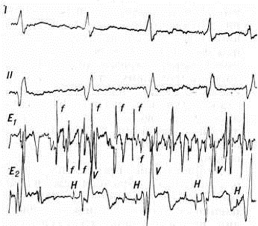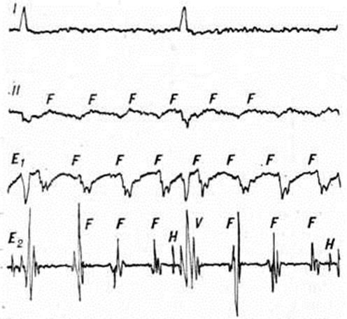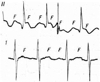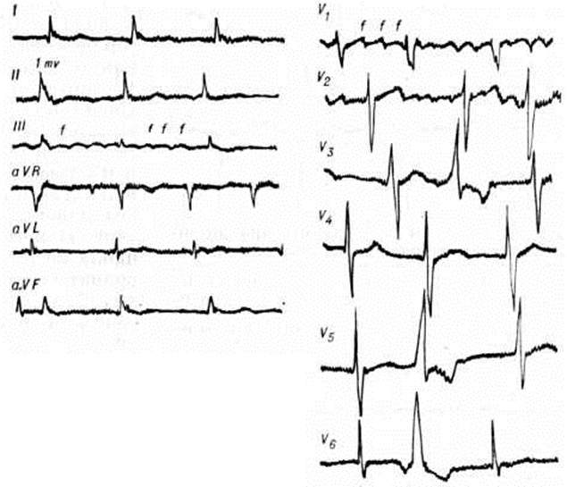 В более редких случаях причинами её возникновения служат нарушения гемодинамики и изменения миокарда при миокардитах, кардиомиопатиях. В очень редких случаях Мерцательная аритмия является следствием травм сердца, в том числе операционной, раздражения предсердий зондом или их электрической стимуляции, электротравмы. Известны случаи возникновения Мерцательная аритмия при токсикоинфекциях (пневмония, тифы и другие), а также интоксикациях (окисью углерода, симпатомиметическими аминами, сердечными гликозидами и другие). По данным разных авторов, острый инфаркт миокарда осложняется Мерцательная аритмия в 5—17% случаев. Ещё реже это нарушение ритма наблюдается при эмболии лёгочной артерии, а также у больных с лёгочным сердцем. Описаны случаи семейной Мерцательная аритмия в сочетании с отосклерозом или без него. Нередко Мерцательная аритмия сочетается с синдромом Вольффа — Паркинсона— Уайта (смотри полный свод знаний Вольффа — Паркинсона — Уайта синдром). Пароксизмы Мерцательная аритмия иногда возникают при значительном психоэмоциональном напряжении или вскоре после него. В связи с этим многие учёные предполагают, что Мерцательная аритмия может иметь чисто психогенное происхождение. Однако более вероятно, что в подобных случаях психоэмоциональные факторы играют лишь роль пускового механизма аритмии у людей с органическими изменениями предсердий или с наличием предпосылок к их ишемии (своеобразная форма ишемической болезни сердца). Патогенез. Для объяснения патогенеза Мерцательная аритмия было предложено несколько теорий, из которых две считаются основными: теория множественных очагов автоматизма и теория циркулярной волны возбуждения. Сущность первой теории, созданной Шерфом (D. Scherf), сводится к тому, что при определённых условиях, например, при длительном перенапряжении предсердий или появлении в их стенках очагов дистрофии или кардиосклероза, в миокарде предсердий образуется множество несогласованно функционирующих очагов автоматизма. Исходящие из этих очагов импульсы частично интерферируют, частично непосредственно возбуждают прилежащий миокард, в результате чего сокращение волокон миокарда предсердий становится совершенно беспорядочным. Согласно второй теории, предложенной Льюисом (Th. Lewis, 1914), при описанных выше условиях создаются предпосылки для кругового движения волны возбуждения по миокарду предсердий вокруг отверстий полых вен. От этой основной волны центробежно отделяются вторичные волны, которые, интерферируя друг с другом, вызывают беспорядочные сокращения мышечных волокон миокарда предсердий. Идея циркуляции волны возбуждения получила развитие в теории повторного входа возбуждения в миокард (re-entry), получившей наибольшее признание. Эта теория состоит в том, что в миокарде возникают предпосылки для циркуляции возбуждения и повторного входа его волны в те участки, из которых оно пришло в патологически изменённую область (рисунок 1).Нередко такая ситуация возникает в результате предсердной экстрасистолы, возбуждающей миокард в тот момент, когда не все его волокна вышли из состояния рефрактерности (так называемый фаза ранимости предсердий, на ЭКГ соответствующая примерно нисходящему отрезку зубца R или начальному отделу сегмента S—Т). В пользу теории повторного входа возбуждения в 