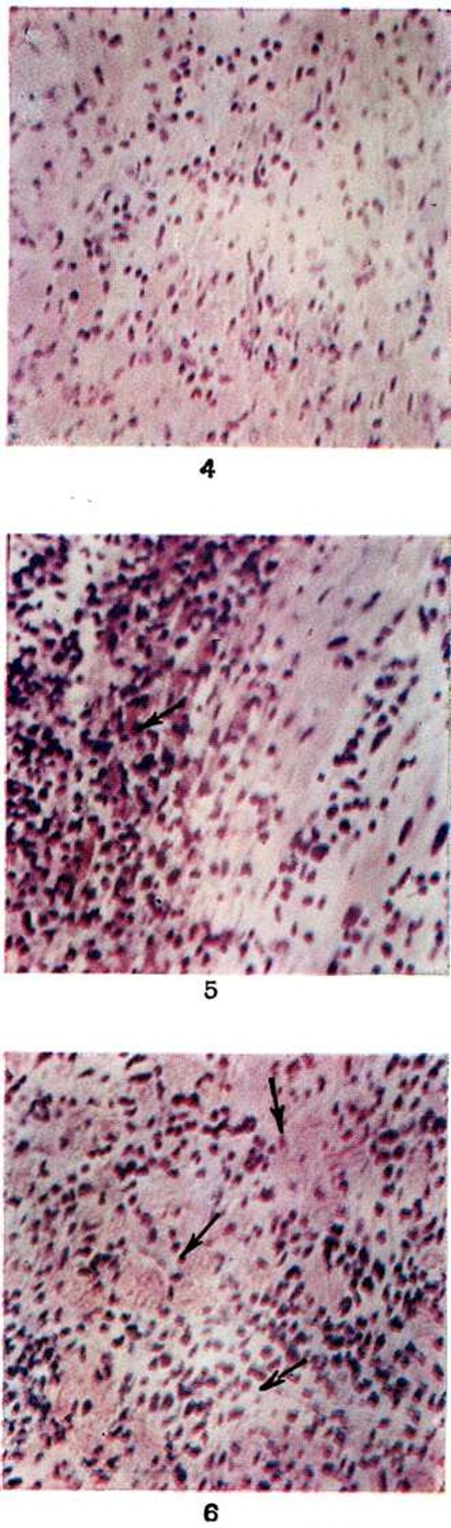 Экссудативный компонент представлен жидкой частью крови и её форменными элементами в различных соотношениях. Преобладание серозного экссудата с небольшим количеством лейкоцитов приводит к развитию острого серозного Миокардит, встречающегося при токсико-инфекционных поражениях миокарда различной этиологии. При этом пучки мышечных волокон раздвинуты серозным экссудатом, содержащим небольшое количество клеток крови, чаще всего — сегментоядерные лейкоциты. Наблюдаются случаи экссудативного Миокардит с преобладанием эозинофилов в экссудате и инфильтратах. Эозинофильный Миокардит нередко является частью синдрома Леффлера и сопровождается эозинофилией и эозинофильной инфильтрацией органов — лёгких, селезёнки и другие (смотри полный свод знаний Леффлера синдром). К клеткам экссудата иногда присоединяются клетки лимфогистиоцитарного инфильтрата из межуточной ткани сердца. Клетки инфильтрата частично трансформируются в клетки плазмоцитарного ряда, и иногда инфильтрат состоит (в основном) из плазматических клеток (смотри полный свод знаний); в этих случаях можно говорить о плазмоцитарном Миокардит (рисунок 6). При длительном течении Миокардит нарастают процессы фиброплазии за счёт размножения фибробластов межуточной ткани сердца и фиброцитарного превращения гистиоцитов. В результате очаг воспаления замещается рубцовой тканью и развивается миокардитический кардиосклероз. Обычно при Миокардит выявляются изменения внутримиокардиальных кровеносных сосудов по типу гиперергического васкулита. Обнаруживаются все стадии васкулита — от фибриноидного некроза до склероза сосудистой стенки с частичной или полной облитерацией просвета сосуда (рисунок 7). Последовательность, при которой пролиферативные процессы следуют за начальными экссудативными, вовсе не является обязательной схемой. Лимфогистиоцитарная инфильтрация может развиваться с первых моментов воспалительной реакции, которая течёт по типу острого пролиферативного воспаления. Как видно из изложенного, при неспецифическом Миокардит отсутствует какая-либо специфика, позволяющая судить об его этиологии. Неспецифическими являются многие Миокардит при инфекционные заболеваниях, тонзиллогенный, лекарственный, поствакцинальный Миокардит, а также Миокардит при миастении, миокардит Абрамова—Фидлера. Миокардит Абрамов а— Фидлера (идиопатпческий Миокардит) в соответствии с клинические, вариантами течения (от латентных форм до злокачественных с быстрым смертельным исходом) имеет широкий диапазон морфологический проявлений— от умеренно выраженного очагового или диффузного неспецифического интерстициального Миокардит до тяжёлых разрушительных процессов в миокарде с обширными участками дистрофии, некроза и воспалительно-клеточной инфильтрации с наличием или отсутствием гигантских клеток. При этом иногда последовательного и синхронного параллелизма интенсивности и распространённости воспалительного процесса и его клинические, проявлений не отмечается.