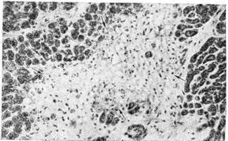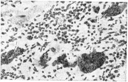 Неспецифический миокардит — наиболее частая форма, обычно характеризующаяся смешанным типом морфологический изменений, при котором одновременно выявляются различные варианты гисто л. картины воспаления. Морфологически проявления варьируют в зависимости от особенностей и соотношения каждого из основных компонентов воспаления — дистрофического, пролиферативного (воспалительно-инфильтративного) и экссудативного, а также от стадии и длительности течения Миокардит Дистрофический компонент воспаления, под которым имеется в виду морфологический отражение нарушений обмена в миокарде (а не сами эти нарушения, то есть миокардиодистрофия в понимании Г. Ф. Ланга), объединяет все формы дистрофических, некробиотических и некротических процессов, которые развиваются в миокарде при различных обстоятельствах, не имеющие какой-либо специфики при включении их в воспалительный комплекс: белковую (паренхиматозную), липидную, водяночно-вакуольную дистрофию (смотри полный свод знаний Дистрофия клеток и тканей). Гистохимические и электронно-микроскопические исследования не выявляют каких-либо особенностей дистрофического компонента воспаления, отличных от известных форм и стадий дистрофии миокарда различного происхождения. Распространённый очаговый кардиомиоцитолиз приводит к опустошению более или менее обширных участков миокарда (рисунок 3), их депаренхиматизации, при которой в этих участках от сократительного миокарда остаётся только аргентофильная строма с сохранившимися в ней остатками кардиомиоцитов и мелкими глыбками бурого пигмента. Эти процессы могут сопровождаться лишь незначительной клеточной реакцией в строме миокарда. В дальнейшем происходит сближение мышечных волокон по периферии депаренхиматизированных гнёзд с последующим замещением их грануляционной и зрелой рубцовой тканью, то есть наблюдается исход в кардиосклероз. Выраженный некробиоз, переходящий в некроз, характеризуется мелко и крупно-глыбчатым распадом цитоплазмы кардиомиоцитов; при этом возможно длительное сохранение сарколеммы и ядер. Интенсивность дистрофических процессов варьирует в широких пределах в зависимости от интенсивности патогенного воздействия, его преимущественной паренхимотропности. Некробиотические процессы приводят к развитию обширных участков некроза миокарда с превращением этих участков в мелкозернистый эозинофильный детрит, окаймлённый зоной лимфогистиоцитарного инфильтрата. Подобные морфологические изменения могут напоминать феномен Артюса (смотри полный свод знаний Артюса феномен) . По характеру воспалительной инфильтрации (пролиферативный компонент воспаления) при интерстициальном (межуточном) Миокардит различают очаговый и диффузный варианты. При первом варианте клетки воспалительного инфильтрата располагаются в виде более или менее крупных, но ограниченных гнёзд (рисунок 4). При втором варианте клетки воспалительного инфильтрата диффузно пронизывают межуточную ткань миокарда, раздвигая сердечные мышечные волокна (рисунок 5), располагаясь вдоль них и охватывая различные по протяжённости участки миокарда. При диффузном Миокардит не обязательно тотальное поражение, охват воспалением всей массы миокарда, что бывает при острейшем, бурно развивающемся Миокардит Большей частью воспаление, даже 