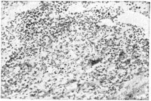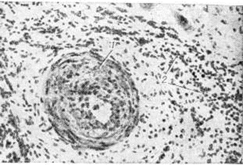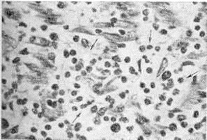 Изучение материала, полученного с помощью эндомиокардиальных биопсий у детей с клинические, диагнозом миокардиопатии, показало, что в большинстве случаев гисто л. картина соответствует этой форме Миокардит Морфологически — это неспецифический интерстициальный Миокардит с лимфогистиоцитарным инфильтратом, параллельно протекающими процессами его резорбции и фиброзного превращения, нерезко выраженным дистрофическим компонентом. Скудность клеточной инфильтрации в большинстве исследованных биоптатов свидетельствует о затухающем или медленно прогрессирующем Миокардит, и идентификация его требует особо тщательного гистологический анализа. В случаях, когда клеточная инфильтрация практически не определяется, перенесённое воспаление подтверждается только наличием полей кардиосклероза. Длительность процесса оценивается по степени развития кардиосклероза. Фоном воспалительной инфильтрации и кардиосклероза служит гипертрофия миокарда, которая отличается некоторой мозаичностью, неравномерностью в распределении гипертрофированных пучков мышечных волокон. Приведённые материалы оправдывают допущение, что Миокардит взрослых в части случаев, возможно, связан с Миокардит детского возраста. Трансплантационный миокардит в морфологическом отношении является также неспецифическим — это реакция отторжения пересаженного сердца. Отнесение этой реакции к миокардитам продиктовано не только морфодинамикой процесса, повторяющей морфодинамику диффузного интерстициального Миокардит в его существенных чертах, но и адекватным отображением в данных электрокардиографии. В гистологический картине доминирует инфильтрация миокарда клетками лимфоидного типа и гистиоцитами. Характерная особенность этого Миокардит— выраженный плазмоцитогенез в клетках инфильтрата с нарастанием числа зрелых плазматических клеток. Гранулематозный (специфический) миокардит характеризуется наличием гранулемы (смотри полный свод знаний) в миокарде (рисунок 8). Он различен по происхождению, но чаще имеет инфекционную этиологию. Наиболее известны туберкулёзный, сифилитический, ревматический и грибковый гранулематозные Миокардит, а также Миокардит при саркоидозе. Гранулематозные элементы туберкулёзного Миокардит могут быть в форме милиарных узелков или солитарных туберкулом с центральным казеозом. При гистологический дифференциальной диагностике следует иметь в виду сходство туберкулёзных гранулем с гранулемами при Миокардит другой этиологии — при криптококкозе, кокцидиоидозе, гистоплазмозе. Многие грибковые Миокардит могут развиваться при лучевой терапии по поводу лейкозов и злокачественных опухолей. Грибковый Миокардит чаще развивается на фоне иммунологической подавленности, а также при грибковом эндокардите у больных с протезами клапанов сердца. Морфологически грибковый Миокардит характеризуется милиарными гранулемами, в центре которых обнаруживают нити грибка. Сифилитическое поражение миокарда в форме диффузного Миокардит и гумм встречается чрезвычайно редко. К гранулематозному Миокардит можно отнести и поражения миокарда в некоторых случаях подострого септического эндокардита с развитием в миокарде так называемый узелков Брахта — Вехтера — мелких гнёзд ишемического некроза миокарда в различной стадии орг