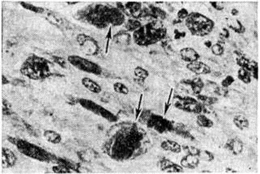 Макроскопически Миосаркома имеет мягковатую консистенцию; на разрезе— розовато-серого цвета, пёстрая за счёт очагов кровоизлияний и некроза. Опухоль чаще имеет плохо различимые границы с окружающими тканями, наблюдаются случаи с мультицентричным ростом. Микроскопически Миосаркома характеризуется клеточным полиморфизмом (рисунок), высокой митотической активностью и другими признаками выраженной анаплазии. Наличие в клетках опухоли гладкомышечных или поперечнополосатых фибрилл имеет дифференциально-диагностическое значение для распознавания разновидностей Миосаркома