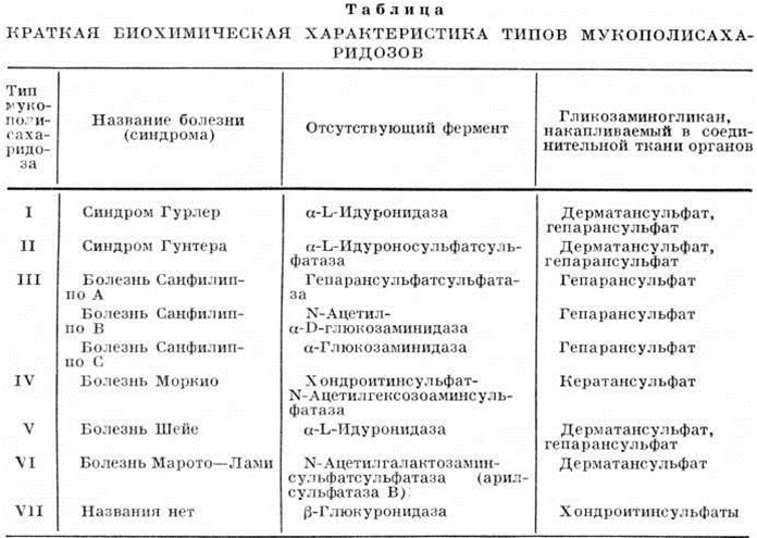 Различают 7 клинико-биохимических типов Мукополисахаридозы: I тип — синдром Гурлер, II тип — синдром Гунтера (смотри полный свод знаний Гаргоилизм), III тип — болезнь Санфилиппо (смотри полный свод знаний Санфилиппо болезнь), IV — болезнь Моркио (смотри полный свод знаний Моркио болезнь), V тип — болезнь Шейе (смотри полный свод знаний Шейе болезнь), VI тип — болезнь Марото — Лами (смотри полный свод знаний Марото — Лами болезнь), VII тип — названия нет.