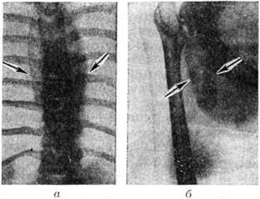 Эти явления чаще возникают при формировании глубоко расположенного Натечник с выраженной реакцией окружающих его тканей, например, при коксите или спондилите. Местные изменения при Натечник характеризуются наличием безболезненной припухлости с положительным симптомом зыбления; кожа над припухлостью обычно не изменена. При наклонности Натечник к прорыву кожа над ним приобретает глянцевитость и красноватый цвет без заметного повышения местной температуры. Глубоко расположенные Натечник, содержащие сгустившийся гной, пальпируются труднее, флюктуация в них выражена слабо, поэтому диагностика их затруднена. Осложнения. Основная опасность в активном периоде развития натечника — возникновение наружного свища (смотри полный свод знаний) и проникновение через него в очаг туберкулёзного воспаления вторичной инфекции, отягощающей течение болезни и состояние больного. При проникновении Натечник в полые органы грудной и брюшной полости (в трахею, бронхи, иногда в аорту, пищевод, слепую, сигмовидную, ободочную и прямую кишку, мочевой пузырь, влагалище), помимо тяжёлого нарушения функции этих органов, образуется внутренний свищ, что усиливает воздействие гноя на организм и нередко приводит к амилоидозу паренхиматозных органов. Диагноз и дифференциальный диагноз не всегда легки. Наиболее часто приходится дифференцировать туберкулёзные и не туберкулёзные абсцессы, особенно при скоплении жидкости и гноя в больших слизистых сумках, при воспалении распадающейся опухоли и другие Распознавание основывается на данных клинические, обследования, диагностических пункций с цитологический исследованием, рентгенодиагностики. Типичная локализация Натечник облегчает диагностику. Рентгенологические выявляемость внутригрудных Натечник зависит от их локализации и величины, а Натечник, располагающихся вне грудной клетки, также от содержания в них извести и от вторичного смещения соседних органов. Следует различать прямые и косвенные рентгенологическое признаки Натечник К прямым признакам относятся чётко очерченные затемнения диаметром 2 сантиметров и больше, при внутригрудной локализации — сливающиеся с тенью позвоночника и контрастно выделяющиеся на фоне лёгких (рисунок 3, а). При иной локализации прямым признаком Натечник является затемнение, чаще продолговатой формы, резко очерченное с периферической стороны, с бледно-пятнистой, крапчатой или зернистой структурой в зависимости от степени обызвествления его содержимого (рисунок 3,6). Косвенным признаком Натечник внелёгочной локализации может быть смещение смежных органов. Так, при локализации Натечник кпереди от шейных позвонков трахея на боковых рентгенограммах будет смещена кпереди. Располагаясь паравертебрально в поясничной области, Натечник ведёт к выпячиванию внешнего контура пояснично-подвздошной мышцы на большем или меньшем протяжении кнаружи с одной или обеих сторон; в норме этот контур прямолинейный или пологовыпуклый. Такое выпячивание может быть обусловлено не только давлением Натечник, но и специфическим псоитом (смотри полный свод знаний). При расположении в забрюшинном пространстве Натечник может сместить соседние органы: мочеточники, кишки и другие, что определяется при контрастном исследовании соответствующих органов. К косвенным признакам На