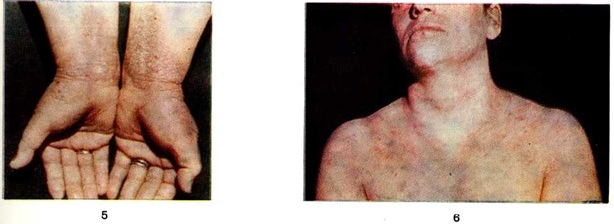 В очагах поражения принято различать три концентрические зоны: периферическую — пигментированную, среднюю — папулёзную и внутреннюю — зону инфильтрации (смотри полный свод знаний) с лихенизацией (смотри полный свод знаний). В свежих очагах периферическая зона отсутствует. Нередко зона инфильтрации с лихенизацией может быть единственной в клинические, картине болезни. При ограниченном Нейродермит бывает один-два, реже несколько очагов поражения. Заболеванию свойствен сухой характер высыпаний, мокнутие (без везикуляции) возникает лишь в отдельных случаях в результате сильных расчёсов и держится весьма непродолжительное время. К атипичным разновидностям ограниченного Нейродермит относят следующие формы: 1) гипертрофический нейродермит Эрманна (синонимы: гипертрофическая, или гигантская, лихенизация Потрие) — редкая форма, характеризующаяся локализацией очагов поражения преимущественно в пахово-бедренных складках, на внутренней поверхности бёдер, резко выраженной инфильтрацией и лихенизацией кожи, нередко с бородавчатоподобными изменениями её (бородавчатый нейродермит Крейбиха), зудом, который особенно сильно выражен и нередко носит приступообразный характер; 2) остроконечный фолликулярный нейродермит Вольфа, при котором папулы имеют остроконечную форму и расположены в области устьев волосяных фолликулов; 3) линеарный нейродермит, чаще локализующийся на разгибательных поверхностях конечностей в виде полосовидных очагов поражения, иногда с бородавчатой (веррукозный линеарный нейродермит Тутона) или шелушащейся (псориазиформный линеарный нейродермит Виньоло-Лутати) поверхностью; 4) депигментированный нейродермит — форма, сопровождающаяся выраженной депигментацией кожи в зонах поражения; 5) декальвирующий нейродермит Крейбиха, сопровождающийся выпадением пушковых волос в зонах поражения. Диффузный нейродермит (синонимы: рассеянный, или разлитой, Нейродермит; хронический диффузный нейродермит; диффузный зуд с лихенизацией; простое хронический пруриго; обыкновенное пруриго Дарье; поздний экссудативный экзематоид Роста; конституциональный нейродермит; синдром Бенье — Брока) отличается более распространённым процессом, чем ограниченный Нейродермит Локализация — лицо (чаще вокруг рта и в области глаз), шея, грудь (цветной рисунок 6), конечности (особенно в сгибах). Иногда процесс принимает универсальный характер. Наряду с нерезко ограниченными буровато-красными участками инфильтрированной и лихенизированной кожи, которые могут захватывать обширные поверхности, отмечаются отдельные мелкие плоские блестящие узелки, расположенные чаще на эритематозном фоне по периферии очагов лихенизации, множественные экскориации. Кожа больных диффузным Нейродермит отличается сухостью в связи с пониженной функцией потовых желёз. У некоторых больных Нейродермит протекает с везикуляцией и мокнутием. При этом в клинические, картине заболевания преобладают не папулёзные высыпания, а наряду с инфильтрацией и лихенизацией отёчность кожи, папуловезикулы, эрозии и эритема островоспалительного характера. Характерен непрекращающийся зуд. На участках разрешившихся высыпаний остаётся временная гиперпигментация кожи. У большинства больных отмечается белый дермографизм (смотри полный свод знаний). В летнее время инт