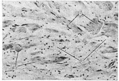Диффузная Нейрофиброма возникает главным образом в результате поражения мелких нервов кожи. Нередко диффузная Нейрофиброма состоит преимущественно из вытянутых, формирующих полосы и тяжи веретенообразных леммоцитов (шванновских клеток), расположенных в слабо развитой строме. Палисадообразная ориентировка ядер, как это отмечается в неврилеммоме (смотри полный свод знаний Невринома), в Нейрофиброма, как правило, не встречается. В диффузной Нейрофиброма иногда обнаруживают пигментные клетки типа меланофоров нейроэктодермального происхождения и осязательные тельца (типа осязательных телец — телец Мейсснера) или пластинчатые тельца (типа телец Фатера— Пачини). Нейрофиброма возникающая в симпатическом стволе, может включать ганглиозные клетки и по микроскопической картине иногда напоминает неинкапсулированную ганглионеврому.