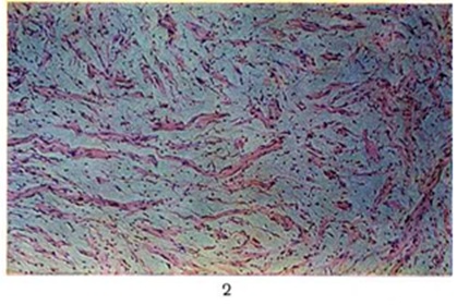Выделяют инкапсулированную и диффузную Нейрофиброма Общим для структуры Нейрофиброма является беспорядочное расположение нервных волокон внутри периневрия, где они разделены вытянутыми клетками и рыхлыми прослойками соединительной ткани (цветной рисунок 2). Инкапсулированная Нейрофиброма возникает главным образом в крупных нервах. Нерв при этом приобретает на некотором протяжении веретенообразную форму за счёт очагового беспорядочного разрастания нервных проводников, разделённых пучками коллагеновых волокон. В Нейрофиброма кожи нервные волокна иногда бывает трудно обнаружить, так как они представлены очень скудно. В инкапсулированной Нейрофиброма часто отмечают нарушения лимфообращения, проявляющиеся признаками выраженного отёка и миксоматоза. По мере распространения отёка из периневрального пространства на внутреннюю часть нервного ствола усиливается его разволокнение, миелиновые волокна исчезают и замещаются фиброзными тяжами. Дальнейший рост такой Нейрофиброма постепенно замедляется и может приостановиться.