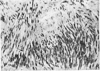 Гистологически клетки опухоли образуют фасцикулярные структуры, располагающиеся параллельными рядами (рисунок 1) или в виде завитков. Встречаются особые палисады из палочковидных ядер (рисунок 2), между которыми расположена нежная волокнистость. Последняя образована цитоплазмой этих клеток и тонкими аргирофильными фибриллами, выявляемыми по способу Фута (смотри полный свод знаний Серебрения методы). Раньше предполагали, что эти фибриллы нервного или глиального происхождения. В современной литературе считается, что они скорее всего представляют собой ретикулярные волокна. По методу Ван-Гизона (смотри полный свод знаний Ван-Гизона метод) фибриллы окрашиваются в желтоватый или розоватый цвет. В длительно растущих и рецидивирующих Невринома количество коллагеновых волокон возрастает. Они могут подвергаться гиалинозу (смотри полный свод знаний).