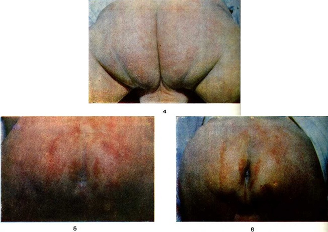 Опрелость вначале проявляется в виде эритемы без резких границ (I степень), затем в глубине складки образуются поверхностные трещины, мелкие эрозии (II степень), в запущенных случаях роговой слой эпидермиса резко Мацерирован, отторгается, образуя обширные мокнущие эрозивные поверхности с неровными очертаниями — III степень (цветной рисунок 4—6). Общее состоянием обычно не страдает; у маленьких детей могут наблюдаться беспокойство плаксивость , ухудшение аппетита, отсутствие прибавки веса (массы) тела.