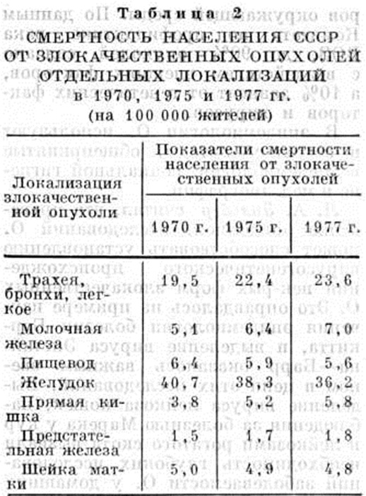 В экономически развитых странах Опухоли занимают второе место (15—23%, по данным ВОЗ) в общей структуре смертности, уступая смертности от сердечно-сосудистых заболеваний. Показатели смертности от злокачественных Опухоли на 100 000 населения в 1950 и 1976 годы составили в США соответственно 141,2 и 175,8, в Англии — 197,0 и 255,4, Японии — 78,9 и 125,3. Во всем мире ежегодно заболевает злокачественными Опухоли свыше 6,3 миллионов человек, а умирает от них не менее 4,3 миллионов человек Рост смертности от злокачественных Опухоли происходит в основном за счёт рака лёгкого, молочной железы и прямой кишки. Число онкологическое больных в СССР, как и во многих других экономически развитых странах, сохраняет тенденцию к росту, особенно среди мужчин. Мужчины в среднем в 1½ раза чаще, чем женщины, заболевают Опухоли лимфатической и кроветворной ткани, в 2 раза чаще — Опухоли желудка и пищевода и в 4½ раза чаще — Опухоли лёгких. Отмечается тенденция к снижению заболеваемости в СССР злокачественными Опухоли пищевода, желудка, шейки матки, однако нарастают показатели заболеваемости злокачественными Опухоли лёгких, молочной железы и прямой кишки (таблица 1). Рост смертности от злокачественных Опухоли в первую очередь может быть обусловлен резким снижением смертности от инфекционных, паразитарных и других болезней, а также постарением населения. Большое значение в изучении показателей смертности имеют общие для многих стран особенности её динамики. Анализ показателей смертности от онкологическое заболеваний за период с 1960 по 1978 год свидетельствует о том, что темпы её роста в СССР существенно замедлились. В 70-е годы заметно снизились показатели смертности от Опухоли пищевода и желудка, тогда как смертность от Опухоли лёгких, молочной железы, прямой кишки повысилась (таблица 2).