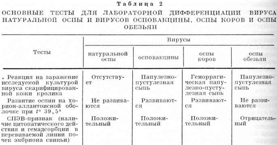 Из биологический методов используют выделение вируса на хорион-аллантоисной оболочке развивающегося куриного эмбриона. Заражают эмбрионы 12-дневного возраста, которых инкубируют после заражения в течение 48—72 часов при t° 34,5—35°. Наличие вируса Оспа натуральная определяется развитием на хорион-аллантоисной оболочке мелких до 1 миллиметров в диаметре белых, округлых, возвышающихся над окружающей непоражённой тканью оспин (рисунок 3, а). Указанные особенности образующихся на оболочке оспин отличают вирус Оспа натуральная от других ортопоксвирусов, в частности вируса осповакцины (рисунок 3, б), коровьей оспы, оспы обезьян и другие Метод выделения вируса на хорион-аллантоисной оболочке доступен большинству лабораторий. Выделение возбудителя можно проводить и на различных культурах клеток, в монослое которых вирус вызывает цитопатический эффект очагового типа и даёт феномен гемадсорбции. Специфичность цитопатического действия может быть проверена в тесте нейтрализации сывороткой к вирусу осповакцины, а также по наличию в инфицированных клетках цитоплазматических включений. При выделении вируса в культуре клеток, дифференциация вируса Оспа натуральная с другими ортопоксвирусами по характеру цитопатического действия затруднена. Выявление вируса (антигена) в культуре клеток может быть значительно ускорено при помощи флюоресцирующих антител (смотри полный свод знаний Иммунофлюоресценция) или иммунопероксидазной техники. Для этой цели инфицированные клетки обрабатывают флюоресцирующей противооспенной (для прямого метода) или антивидовой (для непрямого метода) сывороткой. Наличие антигена определяют по ярко-зелёному свечению цитоплазмы. При использовании иммунопероксидазной техники применяют соответственно меченные пероксидазой противооспенную или антивидовую сыворотки. В этом случае присутствие оспенного антигена проявляется темно-коричневым окрашиванием цитоплазмы клеток. Оба метода могут применяться и для выявления антигена в материалах от больных, если последний содержит неразрушенные клетки. Наиболее рациональным по быстроте и эффективности лабораторный исследованием для диагностики Оспа натуральная является сочетанное использование электронной микроскопии и выделения вируса на куриных эмбрионах. Первый из этих методов позволяет быстро установить, имеются ли в подозрительном материале вирионы поксвирусов или вирусов группы герпеса, а второй обеспечивает не только изоляцию возбудителя, но и его дифференциацию с другими ортопоксвирусами. При нечёткой картине поражений на хорион-аллантоисной оболочке куриных эмбрионов для внутригрупповой дифференциации ортопоксвирусов имеется ряд дополнительных тестов: заражение кроликов исследуемой культурой вируса (путём нанесения её на участок скарифицированной кожи); определение способности формировать оспины на хорион-аллантоисной оболочке куриных эмбрионов, заражённых культурой вируса и инкубируемых при t° 39,5°; установление наличия или отсутствия цитопатического действия и феномена гемадсорбции при заражении культурой вируса перевиваемой линии клеток почек эмбриона свиньи — СПЭВ-признак (таблица 2). Дифференциальный диагноз. Оспа натуральная дифференцируют с ветряной оспой (смотри полный свод знаний), импетиго, лекарственной сыпью (смот