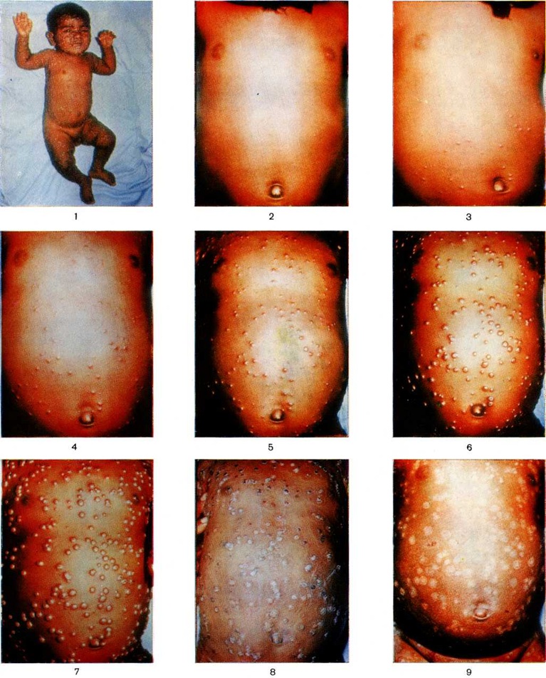Кроме того, вирусы оспенной группы, генетически близкие к возбудителю Оспа натуральная человека, могут вызывать оспу у домашних и диких животных (обезьян, коров, лошадей, овец, коз, свиней, кроликов, птиц). Болезнь чаще вызывается специфическим для данного вида животных возбудителем. Однако известны случаи заболевания (например, у лошадей и других видов животных), вызванные возбудителем коровьей оспы. Человек восприимчив лишь к некоторым вирусам оспы животных (обезьян и коров). Вирус оспы обезьян был выделен в 1958 год в Копенгагене. Первый случай заболевания человека, вызванного этим вирусом, сопровождавшегося пустулёзными высыпаниями, не отличимыми от высыпаний при Оспа натуральная, был зарегистрирован в августе 1970 год в Республике Заир. За период с 1970 по 1980 год в Африке зарегистрирован 51 случай заболевания людей оспой обезьян. При этом от 29 больных выделен вирус оспы обезьян. По данным Бремена (J. G. Breman) и соавторами (1980), допускается возможность передачи возбудителя этой инфекции от человека человеку. Смотри полный свод знаний Поксвирусы. ЭпидемиологияИсточником инфекции является больной человек в течение всей болезни, от начала инкубационного периода до отпадения корочек. Источником инфекции может быть больной любой формой оспы, в том числе и оспы без сыпи. Период максимальной заразительности больного Оспа натуральная— с 3-го до 8-го дня после начала лихорадки. Заразительность больного зависит от степени и тяжести клинические, проявления болезни. Наибольшее эпидемиологические значение имеют больные тяжёлой формой болезни с обильными высыпаниями. При стёртых формах Оспа натуральная наблюдается значительное сокращение времени заразительности больного — иногда до нескольких часов. Вероятность передачи вируса зависит от частоты и степени контакта между больным и восприимчивым лицом. Степень защищённости от заболевания после вакцинации зависит от интервала между последней прививкой и контактом с больным. Хотя в оспенных корках содержится большое количество вирусов, наибольшее значение в распространении инфекции имеет выделение вируса из дыхательных путей. Основной путь передачи инфекции — воздушно-капельный. Рассеивание вируса с капельками слизи и слюны происходит при разговоре и особенно при чиханье и кашле. Вирус также может рассеиваться с частицами пыли при встряхивании инфицированного белья и одежды — воздушно-пылевой путь. Вследствие высокой устойчивости вируса Оспа натуральная в окружающей среде заражённые им вещи и предметы могут служить факторами передачи возбудителя при их пересылке на значительные расстояния (инфицированное белье, хлопок, ковры и так далее). Описаны случаи возникновения генерализованной оспы у лиц, принимавших участие во вскрытии трупов людей, умерших от Оспа натуральная, и обработке секционного материала. Известны случаи трансплацентарной передачи вируса. Описаны лабораторные заражения Оспа натуральная Хотя восприимчивость человека к Оспа натуральная считается абсолютной, наблюдения свидетельствуют, что при однократном общении с больным заболевает 35—40% лиц, не подвергавшихся ранее вакцинации и не болевших в прошлом Оспа натуральная Лицам, общавшимся с больным, вакцинация показана даже в том случае, если диагноз у первого заболевшего был установлен спустя несколько н