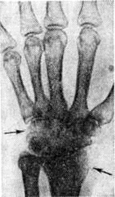 Формируются вальгусное или варусное искривление, патологический вывихи (смотри полный свод знаний), укорочение конечности, контрактуры (смотри полный свод знаний) и анкилозы суставов (смотри полный свод знаний Анкилоз). При остеоартрите исключительно важна ранняя диагностика; она основывается на типичном анамнезе и клинические, картине. Из специальных методов исследования практическое значение имеет определение внутрикостного давления, которое повышено с первых дней заболевания, ещё до появления чётких клинические, признаков гнойного процесса в кости. Первые рентгенологическое изменения появляются только через 10—15 дней от начала заболевания; поэтому установление диагноза лишь на основании рентгенологическое данных является запоздалым и чревато опасностью более тяжёлого течения болезни и более частого развития осложнений. Рентгенологические картина Остеоартрит характеризуется обязательным поражением как тканей самого сустава, так и околосуставных участков костей. Как правило, рентгенография производится в двух стандартных проекциях. В случае недостаточно убедительных данных прибегают к рентгенографии в дополнительных проекциях и к томографии (смотри полный свод знаний), которая позволяет выявить в кости даже мелкие деструктивные очаги. Туберкулёзный Остеоартрит диагностируется на основании регионарного остеопороза, околосуставного очага костной деструкции с неровными нечёткими контурами, сужения суставной щели вследствие разрушения суставных хрящей. В случаях поздней диагностики болезни обнаруживают контактную деструкцию в других костях, образующих сустав (рисунок 1). При туберкулёзном поражении крупного сустава первичный костный очаг на обычных рентгенограммах может не выявляться; его обнаруживают лишь с помощью томографического исследования. Диагностика туберкулёзного Остеоартрит должна подкрепляться характерной клинические, картиной и данными лабораторный исследований. Гнойный Остеоартрит рентгенологически диагностируют только в разгар болезни, на 2—3-й неделе от начала заболевания,— обнаруживают разрушение участка метафиза кости, полное или частичное исчезновение ядра окостенения эпифиза, нарушение нормальных взаимоотношений костей в суставе, утолщение мягких тканей сустава. При этом ранняя диагностика этого тяжёлого поражения (рисунок 2) должна базироваться на соответствующей клинические, картине и данных лабораторный исследований. Раневой (первично-суставной) Остеоартрит рентгенологически проявляется уменьшением ширины суставной щели вследствие разрушения суставных хрящей, появлением поверхностной деструкции в сочленяющихся костях на фоне нарастающего остеопороза, утолщением мягких тканей в области сустава. Процесс может протекать очень бурно, особенно у детей, и быстро закончиться костным анкилозом. Сходную рентгенологическое картину даёт гонорейный Остеоартрит, при котором в случае недостаточно активного лечения быстро (в течение 1½—2 недель) суживается суставная щель, вплоть до полного соприкосновения суставных концов костей. В результате развития поверхностной деструкции через 3—4 недель может образоваться костное сращение.
