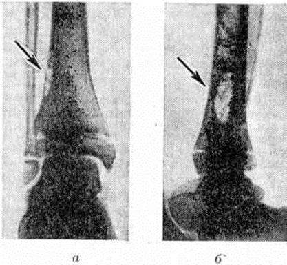 Фиброзный кортикальный дефект появляется в постнатальном периоде и бывает связан с повышенной статикофункциональной нагрузкой на определённый сегмент кости. Развитие фиброзных кортикальных дефектов характерно для детей со статико-функциональными нарушениями опорно-двигательного аппарата (сколиоз, плоскостопие, варусная и вальгусная деформация коленных и тазобедренных суставов и другие). Фиброзный кортикальный дефект проявляется развитием локальной зоны дегенеративно-дистрофической перестройки обычно в метафизарных отделах длинных трубчатых костей, у мест прикрепления связок и сухожилий. Очаг может быть одиночным, но нередко очаги возникают одновременно или последовательно в нескольких костях (например, на медиальной поверхности дистального метафиза бедра и медиально-задней поверхности большеберцовой кости). Возможно развитие фиброзных кортикальных дефектов в костях разных конечностей. Значительно реже очаги выявляются в субпериостальных отделах седалищной кости, лопатки и ключицы. Микроскопически очаг поражения представлен пучками коллагеновых волокон и вытянутых клеток фибробластического типа, среди которых можно встретить многоядерные гигантские формы. Для клинические, картины фиброзного кортикального дефекта характерно медленное нарастание локальных болей и ограниченная припухлость мягких тканей. Нередко патологический процесс протекает бессимптомно, а очаги поражения обнаруживают случайно, при проведении рентгенологическое исследований по другому поводу. Рентгенологические исследование почти всегда позволяет поставить правильный диагноз. Наблюдается характерное метафизарное расположение очагов. Очаги никогда не распространяются через зону метаэпифизарного росткового хряща на эпифиз. Фиброзный кортикальный дефект располагается в толще коркового слоя субпериостально и является краеобразующим. Он имеет сравнительно правильную овоидную или округлоовальную форму и всегда локализуется вдоль оси кости. Возможно истончение и незначительное вздутие прилежащего участка коркового слоя. Очертания кортикального дефекта чёткие, ровные или полициклические, фестончатые. Чаще всего структура очага равномерно прозрачная, иногда мелко или крупноячеистая. Со стороны прилежащих отделов очаг отграничен ободком остеосклероза (рисунок 6). Иногда на уровне кортикального дефекта определяется поперечно-расположенная лоозеровская зона (смотри полный свод знаний Лоозера зоны). Яффе (Н. L. Jaffe) и Л.. Лихтенстайн расценивают фиброзный кортикальный дефект как изолированную форму фиброзной Остеодисплазия, которая подвергается самопроизвольному обратному развитию или стабилизируется, но в отдельных случаях может переходить в опухолевый процесс. Для фиброзных кортикальных дефектов характерно самопроизвольное излечение, которое обычно наступает через 1½—2 года (рисунок 7). При более длительном восстановлении костной структуры показана краевая резекция поражённой кости. Фиброзные кортикальные дефекты следует дифференцировать с туберкулёзным оститом (смотри полный свод знаний Туберкулёз нелёгочный, туберкулёз костей и суставов), хондромиксоидной фибромой (смотри полный свод знаний), эозинофильной гранулемой костей (смотри полный свод знаний), изолированной кистой кости, остеоид-остеомой (смот