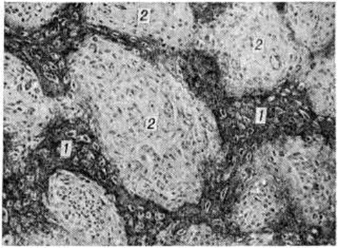 Гистохимические исследования свидетельствуют о том, что коллагеновые волокна при Остеогенез несовершенный имеют необычно высокое содержание пролина и что такой коллаген угнетает in vitro процессы кальцификации, хотя определяемые светооптически процессы минерализации кости при Остеогенез несовершенный остаются неизмененными. Патологическая анатомия. При Остеогенез несовершенный у детей и у взрослых в костях обнаруживают одинаковые изменения. Различны лишь масштабы, глубина и локализация поражения костей. Макроскопически у новорожденных обнаруживают старые сросшиеся внутриутробные переломы рёбер и длинных трубчатых костей в сочетании с псевдоартрозом (смотри полный свод знаний Ложный сустав) и свежими переломами (смотри полный свод знаний), возникшими во время родов. Сросшиеся переломы хорошо заметны из-за резкой деформации, искривления костей и наличия крупных хрящевых мозолей. Переломы могут быть обнаружены макроскопически во всех костях скелета. Исключением являются стопы и кисти, в костях которых можно обнаружить следы старых и свежие микропереломы только при тщательном микроскопическом исследовании. Особенностью большинства переломов является отсутствие обширных кровоизлияний и перифокальной воспалительной инфильтрации мягких тканей, что в основном и определяет свойственную им безболезненность. Весьма характерны изменения костей крыши черепа, представляющих собой нередко тонкую фиброзную пластинку с заключёнными в ней островками костной ткани в виде перекладин. Такие изменения костей черепа, как правило, несовместимы с жизнью вследствие тяжёлой травматизации головного мозга в родах. При позднем Остеогенез несовершенный макроскопически определяют обилие старых заживших переломов трубчатых костей и ложных суставов, а также значительные искривления позвоночника, костей таза и конечностей, обусловленные не только неправильным сопоставлением костных отломков в процессе заживления перелома, но и приспособительной перестройкой костей в условиях изменённой статической нагрузки. Например, при невозможности к передвижению в вертикальном положении больные приспосабливаются передвигаться на четвереньках или ползком, что приводит к значительному искривлению трубчатых костей верхних и нижних конечностей, а также костей таза. Кости отличаются необыкновенной хрупкостью и легко режутся ножом. На распилах длинных трубчатых костей корковое вещество резко истончено (рисунок 1), поэтому их костномозговая полость выглядит непропорционально широкой. А. В. Русаков обращал внимание на своеобразную форму черепа при позднем Остеогенез несовершенный: сравнительно слабо развитую лицевую его часть и крупные шаровидной формы мозговые отделы. Эти изменения нередко сочетаются с расширением боковых желудочков мозга, выбуханием из глазниц глазных яблок (глаза навыкате) и необычной круглоголовостью в сочетании с водянкой желудочков мозга. Микроскопически при врождённом и позднем Остеогенез несовершенный обнаруживают однотипные изменения: недостаточное развитие основного вещества (рисунок 2) во всех костях, развивающихся как на хрящевой, так и на соединительнотканной основе. Эпифизарные хрящи имеют нормальную структуру, зона предварительного обызвествления хряща и зона его рассасывания имеют обычные к