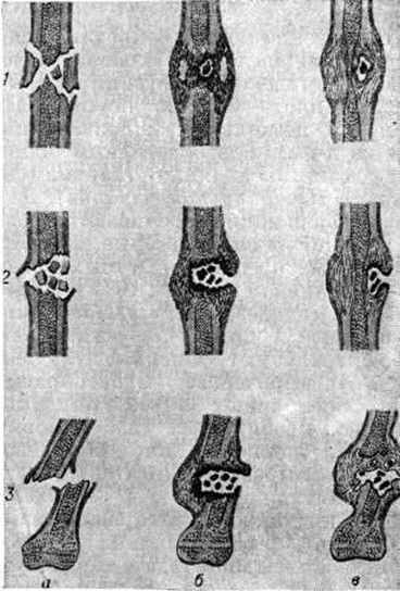 После проведения полноценного бактериологические исследования в назначенное лечение вносят необходимые изменения. С целью своевременной корректировки антибактериальной терапии через каждые 7 дней производят повторные антибиотикограммы. Повышение общей сопротивляемости организма имеет большое значение в комплексном лечении острого гематогенного Остеомиелит Оно осуществляется по нескольким направлениям, среди которых первоочередным является дезинтоксикация организма (смотри полный свод знаний Дезинтоксикационная терапия). Для дезинтоксикации переливают кровь и применяют внутривенные инфузии различных сред в возрастных дозах (растворы нативной плазмы, 10% раствор альбумина, гемодеза, гидролизина, аминопептида и другие), которые связывают и нейтрализуют токсины, улучшают периферическое кровообращение, восполняют объем циркулирующей крови, а их глобулиновые фракции являются дополнительным резервом выработки антител. Введение полиглюкина, 10% раствора глюкозы с инсулином, кокарбоксилазы, АТФ, 2,4% раствора эуфиллина улучшает метаболизм миокарда и сердечную деятельность, оказывает положительное влияние на лёгочный кровоток и другие В целях профилактики тромбозов при явлениях гиперкоагуляции назначают лечебный дозы гепарина (200— 300 ЕД на 1 килограмм веса в сутки), при наличии ацидоза дозы гепарина увеличивают в 1½—2 раза. При явлениях гипокоагуляции назначают гепарино-контрикаловый комплекс (суточная доза гепарина 50—100 ЕД на 1 килограмм веса, контрикала — 5000— 8000 ЕД на 1 килограмм), а при нарастании фибринолиза — гепарин (50 ЕД на 1 килограмм) с контрикалом и сухой плазмой. Прогноз в значительной степени зависит от возраста ребёнка, сроков начала лечения и его полноценности. Наиболее благоприятных результатов удаётся достичь у детей в возрасте старше 1 года, когда лечение начато не позднее 3—5-го дня от момента заболевания. В этих случаях воспалительный процесс останавливается, начинается репаративная перестройка кости, приводящая к восстановлению её формы и структуры (рисунок 7). Если лечение начато несвоевременно, то в конце 3-й — начале 4-й недель начинают выявляться признаки перехода острого Остеомиелит в хронический стадию. Профилактика: своевременное выявление и лечение очагов хронический воспаления у беременных; правильный гигиенические уход за новорожденным, недопущение инфицирования у них пупочной ранки; предотвращение возникновения у детей любых вирусных инфекций и воспалительных процессов; раннее выявление и своевременная санация у детей хронический гнойно-воспалительных очагов; закаливание детей; правильный режим питания и так далее Острый остеомиелит после огнестрельных раненийРазнообразные по характеру и клинические, проявлению гнойно-воспалительные процессы, возникающие вследствие огнестрельных повреждений костей, обозначают условным термином «огнестрельный остеомиелит». Своеобразие течения воспалительного процесса в костной ране при огнестрельном Остеомиелит обусловлено сложной структурой раны, наличием функциональных расстройств, обширных участков повреждённых мягких тканей, наличием костных отломков, некротизированных участков кости, загрязнением раны инородными телами и микроорганизмами. Огнестрельный Остеомиелит возникает после недостаточной хирургической обработк