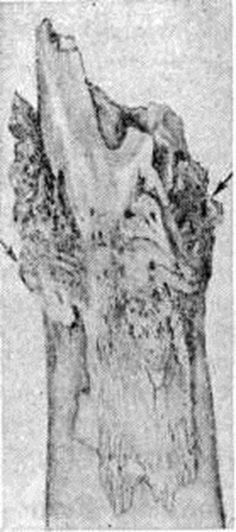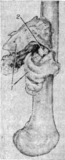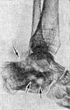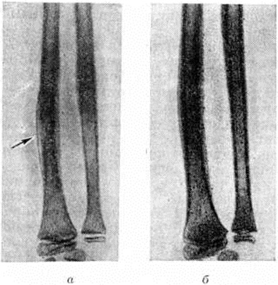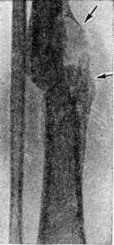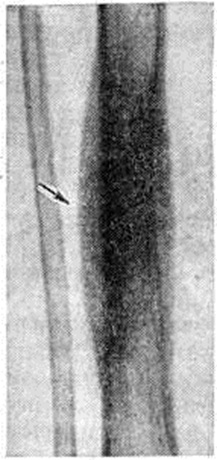 Токсическая (адинамическая) форма гематогенного Остеомиелит встречается у 1—3% больных. Заболевание развивается молниеносно. В течение первых суток нарастают явления тяжёлого токсикоза: гипотермия, менингеальные симптомы, потеря сознания, судороги, сменяемые адинамией; развивается острая сердечнососудистая недостаточность, снижается АД. Местные воспалительные явления проявиться не успевают: больные погибают в первые дни болезни в результате глубоких метаболических нарушений. Осложнения. Наиболее характерным и тяжёлым осложнением острого гематогенного Остеомиелит является сепсис (смотри полный свод знаний), который особенно часто развивается при запоздалом или неправильном лечении заболевания. Гнойный артрит прилежащих суставов в одних случаях возникает гематогенно, одновременно с очагом воспаления в кости в результате генерализации септического процесса, в других — вследствие распространения инфекции из костного очага по лимфатических, путям или прорыва гноя из кости в полость сустава. У 8— 10% больных (при септико-пиемических формах — у 30%) возникают метастатические гнойные очаги во внутренних органах с развитием септической пневмонии, гнойного плеврита, перикардита, миокардита, абсцесса мозга и другие Патологический перелом кости, в том числе эпифизеолиз (смотри полный свод знаний Переломы), возникает в результате разрушения кости, нередко с исходом в ложный сустав (смотри полный свод знаний). Эпифизарный и метафизарный Остеомиелит вследствие близкого расположения очага к ростковой зоне может приводить к нарушению роста и значительным деформациям костей (искривлению, укорочению, реже удлинению), патологический вывиху (смотри полный свод знаний), контрактурам.) или анкилозу (смотри полный свод знаний). Диагноз. Характерный анамнез и типичная клинические, картина местной формы гематогенного Остеомиелит (стойкая высокая температура тела, резкие боли в области поражения кости, нередко присоединение явлений острого артрита) помогают поставить диагноз. Раннее распознавание септико-пиемической формы связано с известными трудностями в связи с преобладанием общих симптомов над мало выраженными начальными местными, особенно у маленьких детей. Нередко в качестве первичного диагноза фигурируют травма, ревматизм, пневмония, скарлатина и другие От ошибок могут предохранить тщательная пальпация и проверка подвижности конечностей, позволяющие выявить болевую зону, наличие отёка, ограниченную подвижность в суставе, защитную контрактуру. Основным ранним симптомом местной и септико-пиемической форм гематогенного Остеомиелит является боль в конечности, усиливающаяся при движениях, нагрузке по продольной оси, пальпации и перкуссии. Путем пальпации можно определить усиленную пульсацию магистральной артерии (плечевой или бедренной), а при надавливании на них — выраженную болезненность. Обязательны повторные посевы крови на содержание в ней бактерий. Отсутствие местных симптомов и быстрое течение токсической формы Остеомиелит создают большие трудности для своевременной диагностики. Большую ценность для диагностики представляет рентгенологическое исследование. Наиболее ранним косвенным рентгенологическое признаком острого Остеомиелит является утолщение и деформация мягких тканей, окружающих кость, 