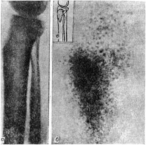 Самые ранние рентгенологическое признаки огнестрельного и травматического хронических Остеомиелит появляются через 3— 4 недель после травмы. Первый прямой симптом его — остеопороз жизнеспособных отломков костей, который особенно отчётливо определяется, если имеются потерявшие связь с надкостницей и сосудами омертвевшие отломки. В то время как живая кость подвергается остеопоротической перестройке, в некротизированных участках этот процесс не происходит, они могут в неизменённом виде находиться в тканях годами, поддерживая воспаление. Выглядят некротизированные участки более плотными по сравнению с порозной, сохранившей жизнеспособность костью. Другим сравнительно ранним признаком воспаления в области отломков является разрушение их краёв, вследствие чего они теряют свою угловатость, резкую очерченность, контуры их становятся нечёткими. И, наконец, третий ранний признак Остеомиелит— появление периостальных наслоений (смотри полный свод знаний Периостит) вдоль концов отломков. Наслоения эти отделены от кости полоской просветления, обусловленной грануляционной тканью, разрастающейся между костью и отслаивающейся надкостницей. В дальнейшем эти концевые участки отломков, окружённые почти со всех сторон воспалительными грануляциями или гноем, в наибольшей степени подвержены секвестрации. Наряду с секвестрацией появляются все новые и новые очаги воспалительной деструкции в живых участках кости, вокруг которых на фоне нарастающего регионарного остеопороза развивается характерный для хронический Остеомиелит остеосклероз (рисунок 17). В воспаление вовлекается и образующаяся костная мозоль. Рентгенологические исследование при Остеомиелит должно обязательно проводиться перед каждым оперативным вмешательством, а при наличии гнойных затёков или свищей дополняться абсцессографией (смотри полный свод знаний) или фистулографией, с помощью которых (при условии тугого заполнения) удаётся выявить скрытые секвестры и другие источники нагноения. Определённую роль, особенно в дифференциальной диагностике хронический Остеомиелит и опухоли кости, начинает играть радиол, метод исследования. Сцинтиграфия (смотри полный свод знаний) после введения изотопов (пирофосфата технеция или стронция) помогает установить первоначальные признаки воспалительного процесса и распространённость его в различных костях раньше, чем рентгенография (рисунок 18), однако мелкие секвестры и остеомиелитические очаги легче обнаружить с помощью рентгенологическое метода. При лабораторный исследовании крови в фазе ремиссии обнаруживается умеренно выраженная анемия и лейкоцитоз со сдвигом формулы влево при заметном ускорении РОЭ. Количество общего белка крови, как правило, находится в пределах средних цифр нормы, но наблюдается диспротеинемия: гипоальбуминемия, гиперглобулинемия (главным образом за счёт гамма-глобулиновой фракции) и снижение белкового коэффициента. В фазе обострения возникают изменения, типичные для вспышки гнойного процесса: нарастают гипохромная анемия, лейкоцитоз, нейтрофилез, ускоряется РОЭ, диспротеинемия становится более выраженной. Исследование кислотно-щелочного равновесия при хронический Остеомиелит нередко указывает на развитие в крови компенсированного метаболического ацидоза. Дифференциальны