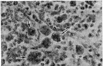 Микроскопическая картина кроветворной ткани костного мозга зависит от формы заболевания. Наиболее характерна гиперплазия мегакариоцитарного ростка, отличающегося полиморфизмом клеток, не дающих положительной ШИК-реакции. Отмечают пролиферацию эритроцитарного и гранулоцитарного ростков. При электронно-микроскопическом исследовании костного мозга выявляют нарушение ядерно-цитоплазматического соотношения в предшественниках эритроцитов, гиперплазию мегакарноцитов, увеличение размеров комплекса Гольджи (пластинчатого комплекса). Под цитоплазматической мембраной мегакарноцитов отмечают накопление гранул серотонина, с воздействием которого связывают усиленный фиброз костного мозга. Селезёнка увеличена, вес её может достигать нескольких килограммов; капсула утолщена, с рубцами на месте перенесённых инфарктов; на разрезе ткань плотная, серо-красная с бурым оттенком. Микроскопически в селезёнке на фоне сохранённых лимфоидных фолликулов с мелкими светлыми центрами обнаруживают периваскулярный фиброз стромы, склеропигментные узелки и очаги экстрамедуллярного (внекостномозгового) кроветворения со скоплением мегакарноцитов (рисунок 2). Печень резко увеличена, коричневато-красного цвета; часто наблюдаются признаки портальной гипертензии (асцит). В печени в просветах капилляров находят комплексы незрелых клеток крови, а также развивающийся фиброз стромы. В цитоплазме гепатоцитов обнаруживают гемосидерин. Лимф, узлы брюшной полости незначительно увеличены. В них сохраняются лимфоидные фолликулы и встречаются очаги экстрамедуллярного кроветворения. Изредка очаги экстрамедуллярного кроветворения встречаются в кишечнике, лёгких, надпочечниках и жировой ткани. Клиническая картина. Заболевание может протекать бессимптомно на протяжении многих месяцев и лет. Ранними субъективными симптомами являются слабость, недомогание, чувство тяжести в левой подрёберной области; объективным симптомом — спленомегалия, которая может выявиться случайно. Увеличение селезёнки зависит от продолжительности заболевания. На ощупь селезёнка обычно плотная; со временем может достигать громадных размеров, с чем связано появление тяжести в левой подрёберной области, а также расстройство функции желудочно-кишечного тракта из-за сдавления желудка и кишок. Спленомегалия часто сопровождается развитием анемии, тромбоцитопении, реже панцитопении, патогенетически связанных с гиперспленизмом. У некоторых больных развивается скрытая или явная сердечная недостаточность в результате увеличения объёма циркулирующей плазмы, вызванного спленомегалией. Увеличение печени наблюдается у 2/3 больных, но лишь в единичных случаях гепатомегалия встречается без спленомегалии. Портальная гипертензия (смотри полный свод знаний) развивается у 10— 20% больных, для неё характерны асцит, периферические отеки, а также кровотечения из расширенных вен пищевода и желудка. Лимфатических, узлы в ряде случаев могут быть увеличены. Клинические, картина часто определяется анемией; у отдельных больных наблюдается эритремический синдром, то есть повышены показатели красной крови. При наличии тромбоцитопении или функциональной неполноценности тромбоцитов (например, нарушение их агрегации, снижение содержания III фактора и другие) нарушается микроциркулят