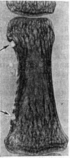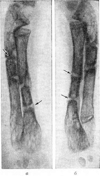 Метафизы длинных трубчатых костей утолщаются, приобретают чашеобразный вид, что обусловлено задержкой обызвествления остеоидных балок, образующихся вблизи зоны роста (рисунок 5). Дифференциальную диагностику Остеопатия нефрогенная у детей проводят с витамин-D-дефицитным рахитом (смотри полный свод знаний), гипофосфатазией (смотри полный свод знаний), несовершенным остеогенезом (смотри полный свод знаний: Остеогенез несовершенный), хондродистрофией (смотри полный свод знаний), мальабсорбции синдромом (смотри полный свод знаний), с идиопатической гиперкальциемией детского возраста (смотри полный свод знаний: Гиперкальциемия). При дифференциальной диагностике с рахитом имеет значение время возникновения изменений со стороны костной системы ребёнка. Клинические, проявления рахита обычно обнаруживаются рано, в возрасте 1½—3 месяцев и сопровождаются гипераминоацидурией (смотри полный свод знаний: Аминоацидурия) и метаболическим ацидозом. Гипофосфатазия проявляется также в первые месяцы жизни ребёнка и характеризуется пониженным содержанием или отсутствием щелочной фосфатазы в крови и повышенной экскрецией фосфоэтаноламина с мочой. Цистиноз (смотри полный свод знаний) по клинике и биохимическим сдвигам сходен с синдромом де Тони—Дебре—Фанкони; его диагностика основана на обнаружении кристаллов цистина в роговице и в лейкоцитах. Для синдрома Лоу (смотри полный свод знаний: Лоу синдром) характерно одновременное поражение глаз, центральная нервная система и повышенное выведение с мочой кетокислот. При хронический тирозинозе (смотри полный свод знаний)) имеет место гепатоспленомегалии, желтуха и геморрагический синдром. Для идиопатической гиперкальциемии характерен остеосклероз во многих костях скелета, в том числе в костях таза по краю вертлужных впадин, в лобной и основной костях черепа, лопатке. Уплотняются также тела позвонков, короткие кости запястья и предплюсны. В длинных трубчатых костях остеосклероз локализуется в основном в метафизах, имея или сплошной или лентообразный вид. Длинные трубчатые кости, особенно нижних конечностей, при этом бывают искривлены (рисунок 6). Общие принципы терапии Остеопатия нефрогенная включают мероприятия, улучшающие всасывание кальция и витамина D, активацию его в печени и почках и превращение в гормон (1а, 2, 5-дигидрокси-холекальциферол). Активация ферментативных систем, осуществляющих гидроксилирование витамина D, возможна при введении таких препаратов, как фенобарбитал. При отсутствии эффекта назначаются высокие дозы витамина D3 и его гидроксилированных форм; применяются большие дозы препаратов фосфора и кальция. Лечение проводят под контролем содержания фосфора в крови, активности щелочной фосфатазы и выведения кальция и фосфора с мочой. Оперативную коррекцию костных деформаций проводят не раньше, чем через 2 года после стойкой клинико-биохимической ремиссии. Профилактика Остеопатия нефрогенная у детей заключается в лечении основного заболевания. Чем раньше начато лечение, тем реже возникают показания к оперативной коррекции костных деформаций.